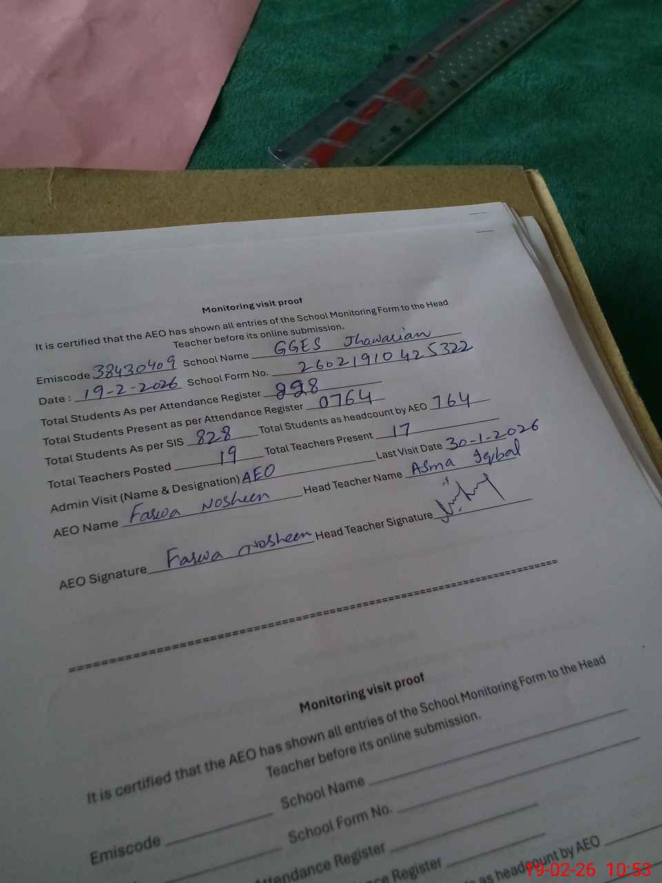 | Certified that this School was Inspected by the Undersigned MEA/DMO Today and the Information Stated Above is as Per Record. | |||||