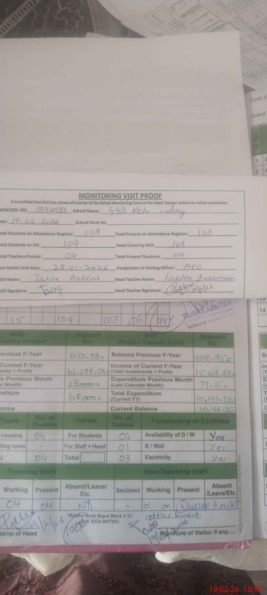 | Attendance Register | Head Teacher | MEA with School | Visit Proof |