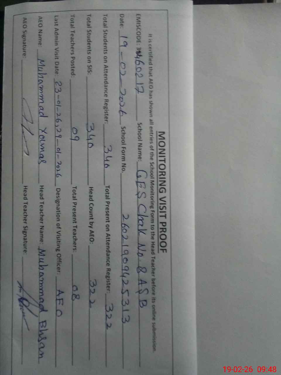 | EMIS Code: 38460217 | Name of School: GES CHAK NO.8 A-SB | |||
