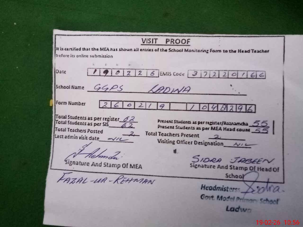 | Certified that this School was Inspected by the Undersigned MEA/DMO Today and the Information Stated Above is as Per Record. | |||||