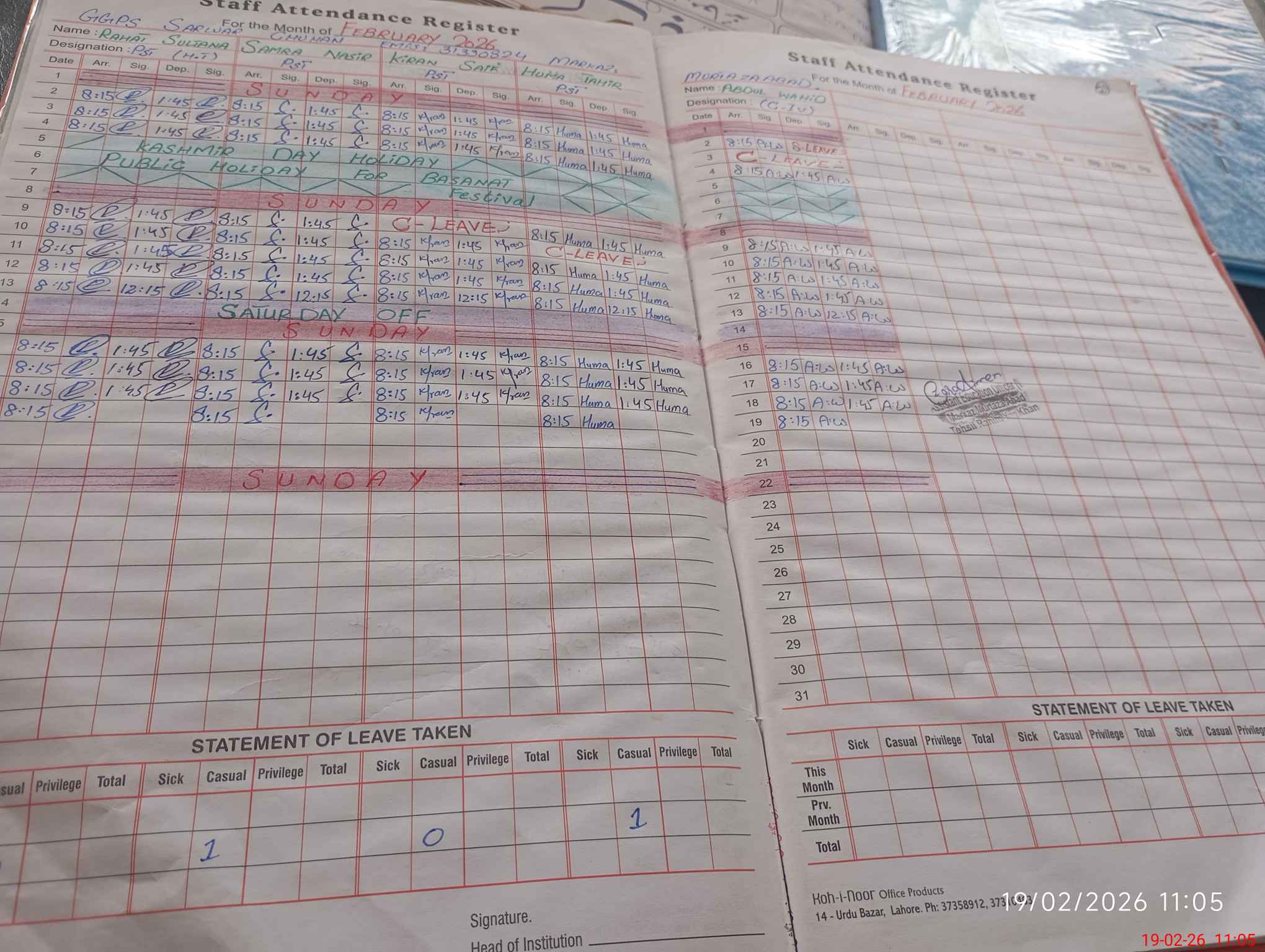 | Leave | Duty | Absent | Maternity | Medical | Ex- Pak |