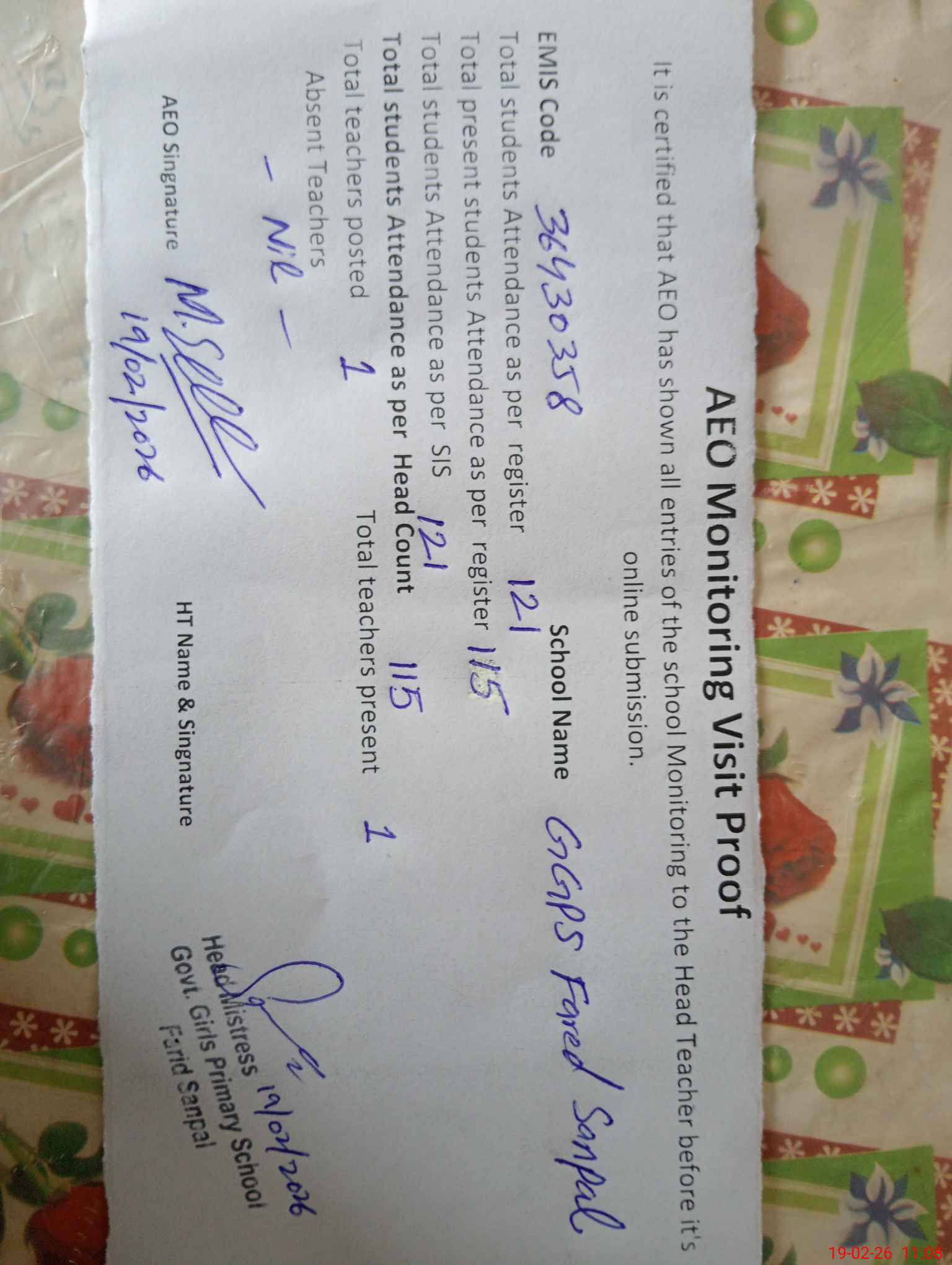 | Attendance Register | Head Teacher | MEA with School | Visit Proof |
