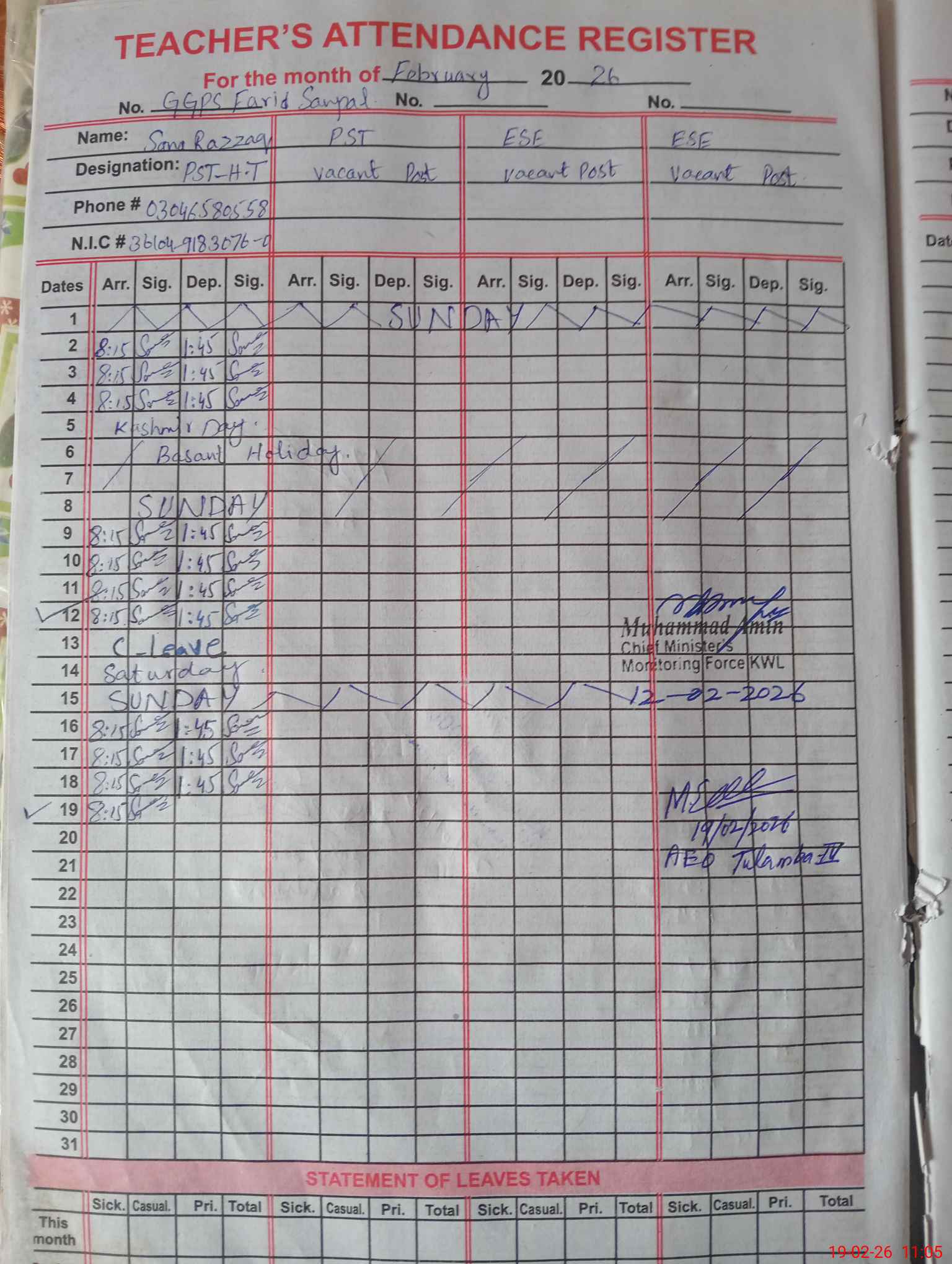 | Name: Sa**** Ra**** Designation: (School Headmaster's/Headmistress's) PST Phone/Cell Number: 03**** |