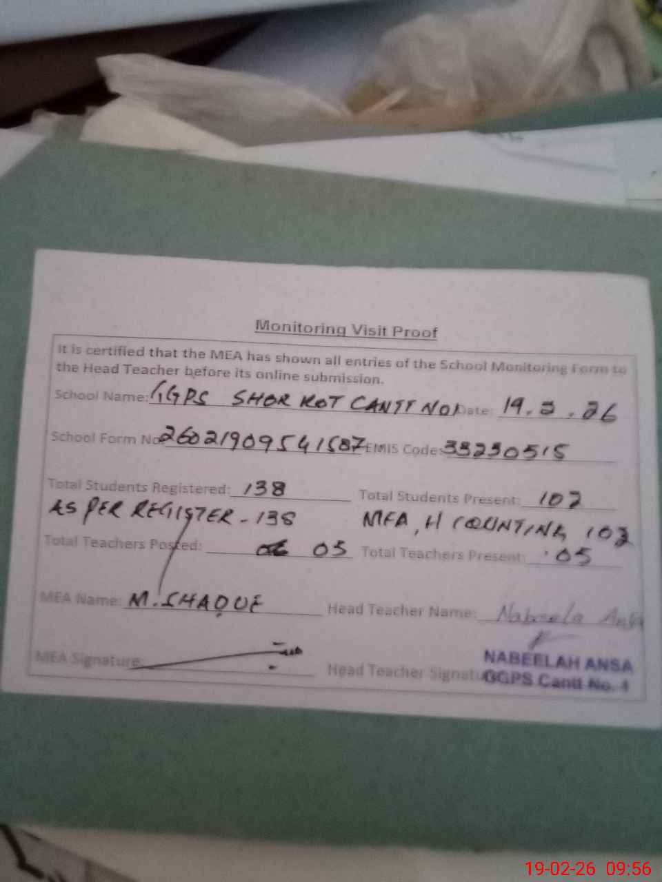 | Certified that this School was Inspected by the Undersigned MEA/DMO Today and the Information Stated Above is as Per Record. | |||||
