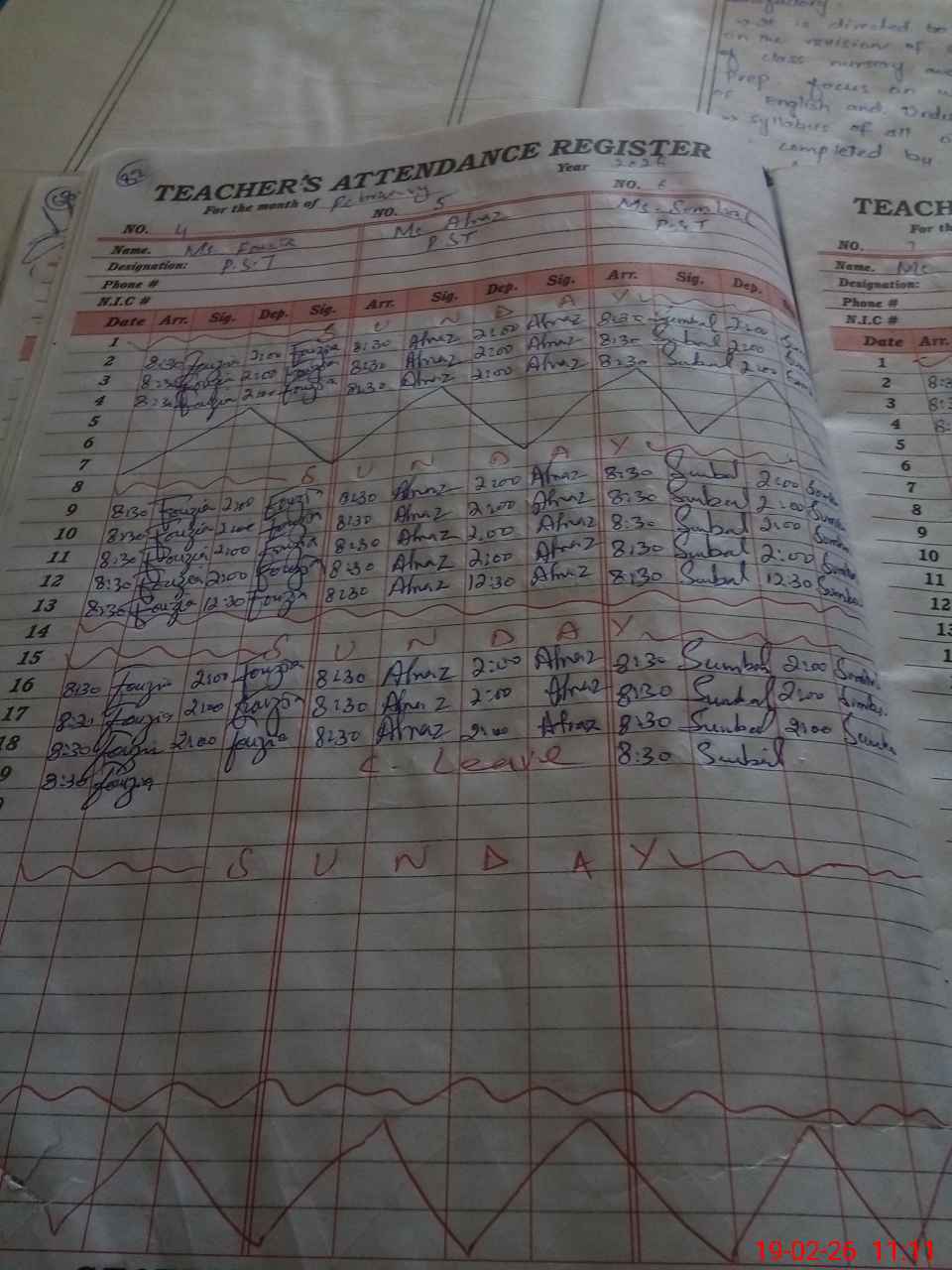 | CNIC | Full Name | Designation | R/C | Absence During Last Calender Month |