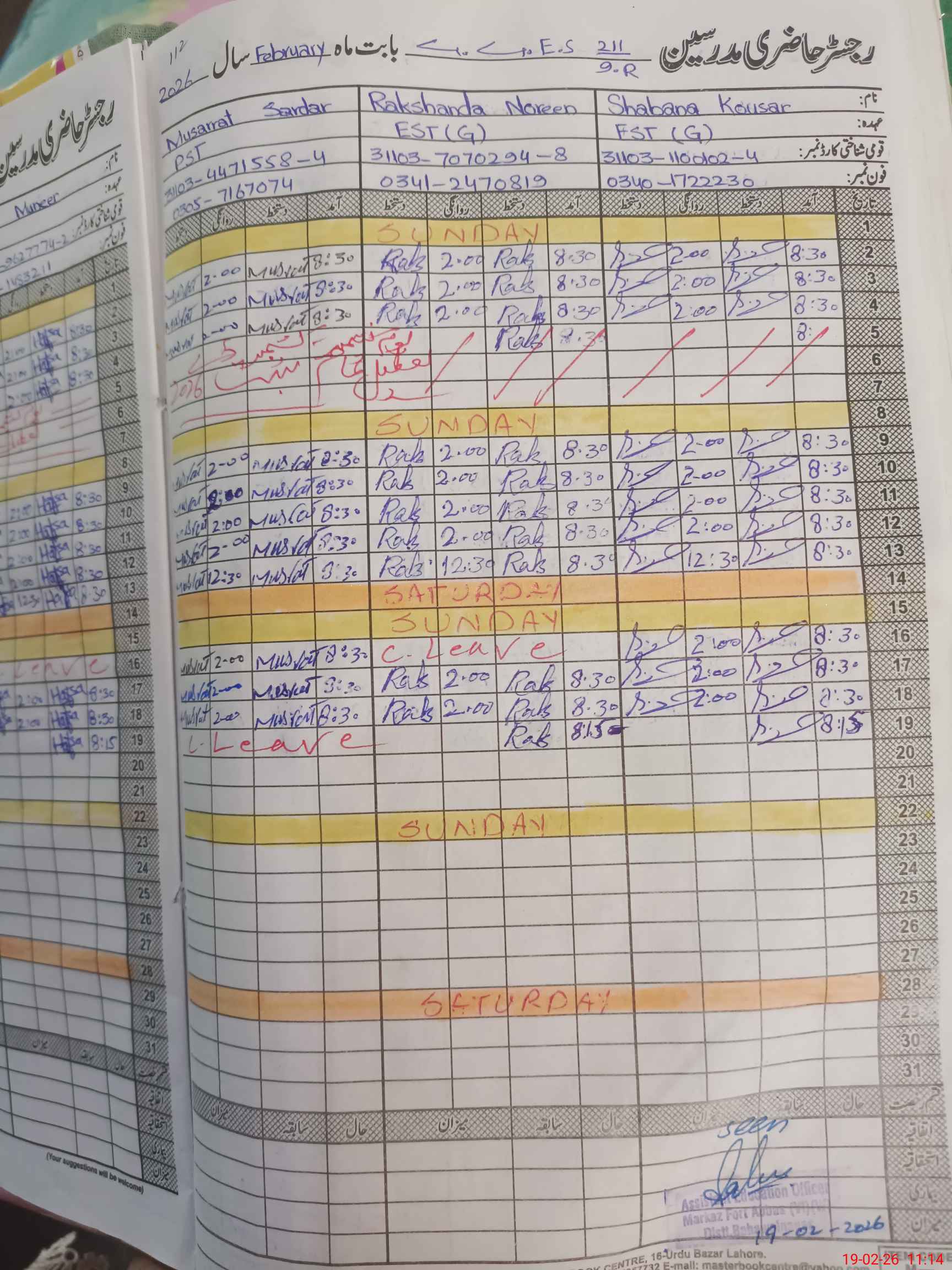| CNIC | Full Name | Designation | R/C | Absence During Last Calender Month |