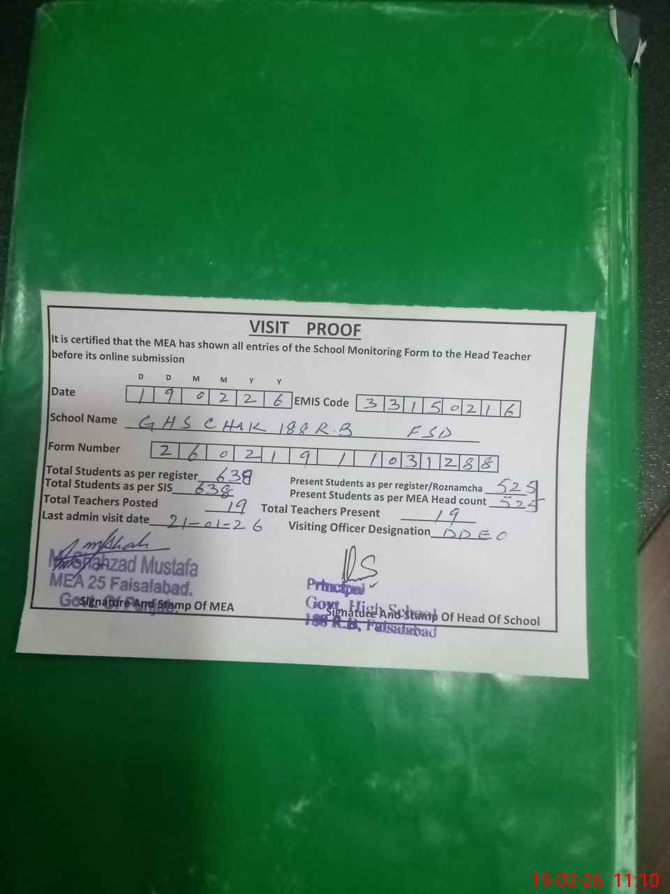 | Certified that this School was Inspected by the Undersigned MEA/DMO Today and the Information Stated Above is as Per Record. | |||||