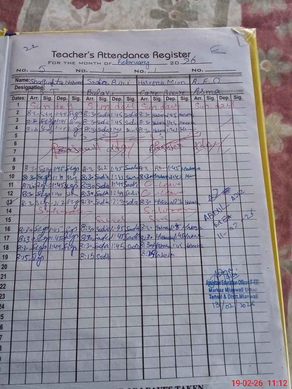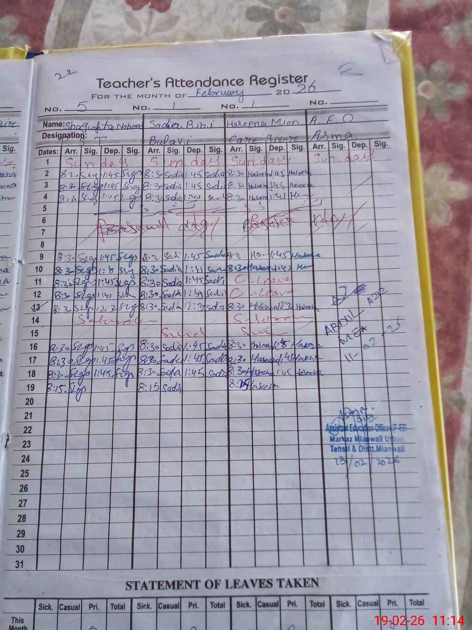 | CNIC | Full Name | Designation | R/C | Absence During Last Calender Month |