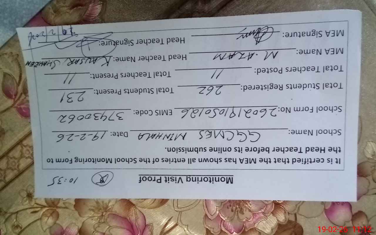 | Certified that this School was Inspected by the Undersigned MEA/DMO Today and the Information Stated Above is as Per Record. | |||||