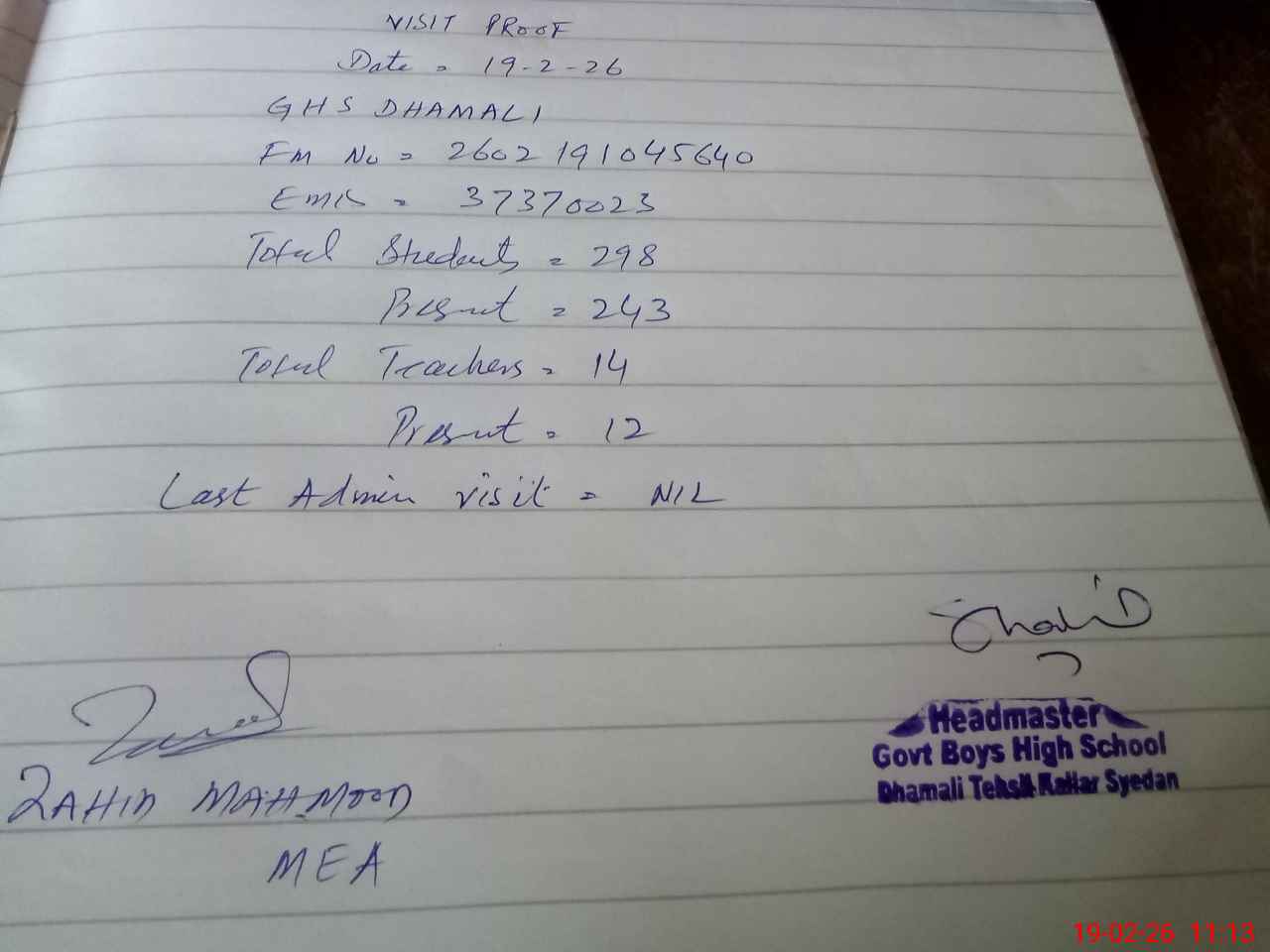 | Certified that this School was Inspected by the Undersigned MEA/DMO Today and the Information Stated Above is as Per Record. | |||||