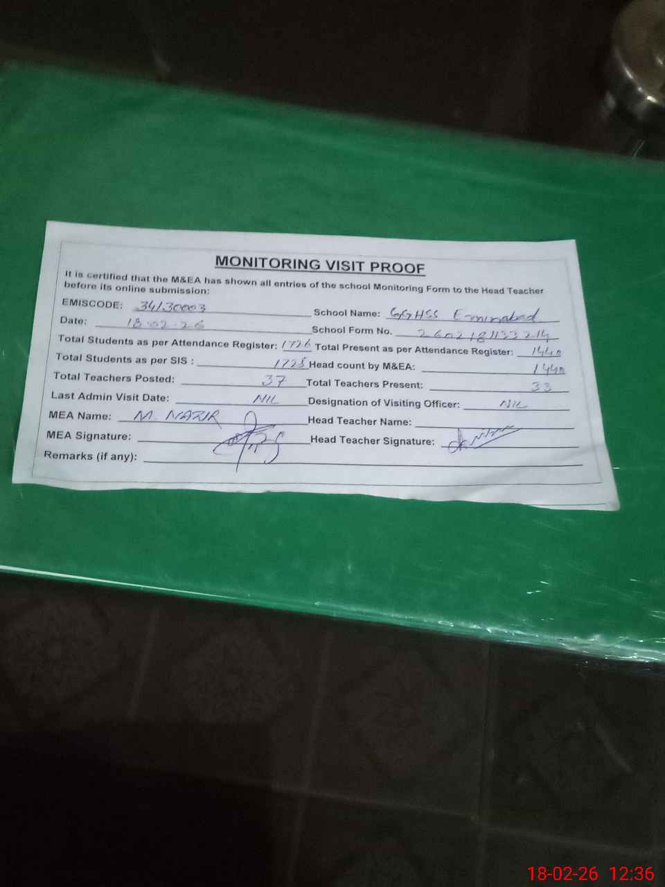 | Attendance Register | Head Teacher | MEA with School | Visit Proof |