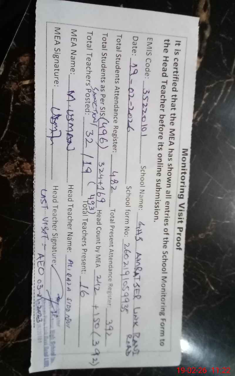 | EMIS Code: 35220101 | Name of School: GHS AMRATSER LINK RAVI ROAD (Newly Upgraded) | |||