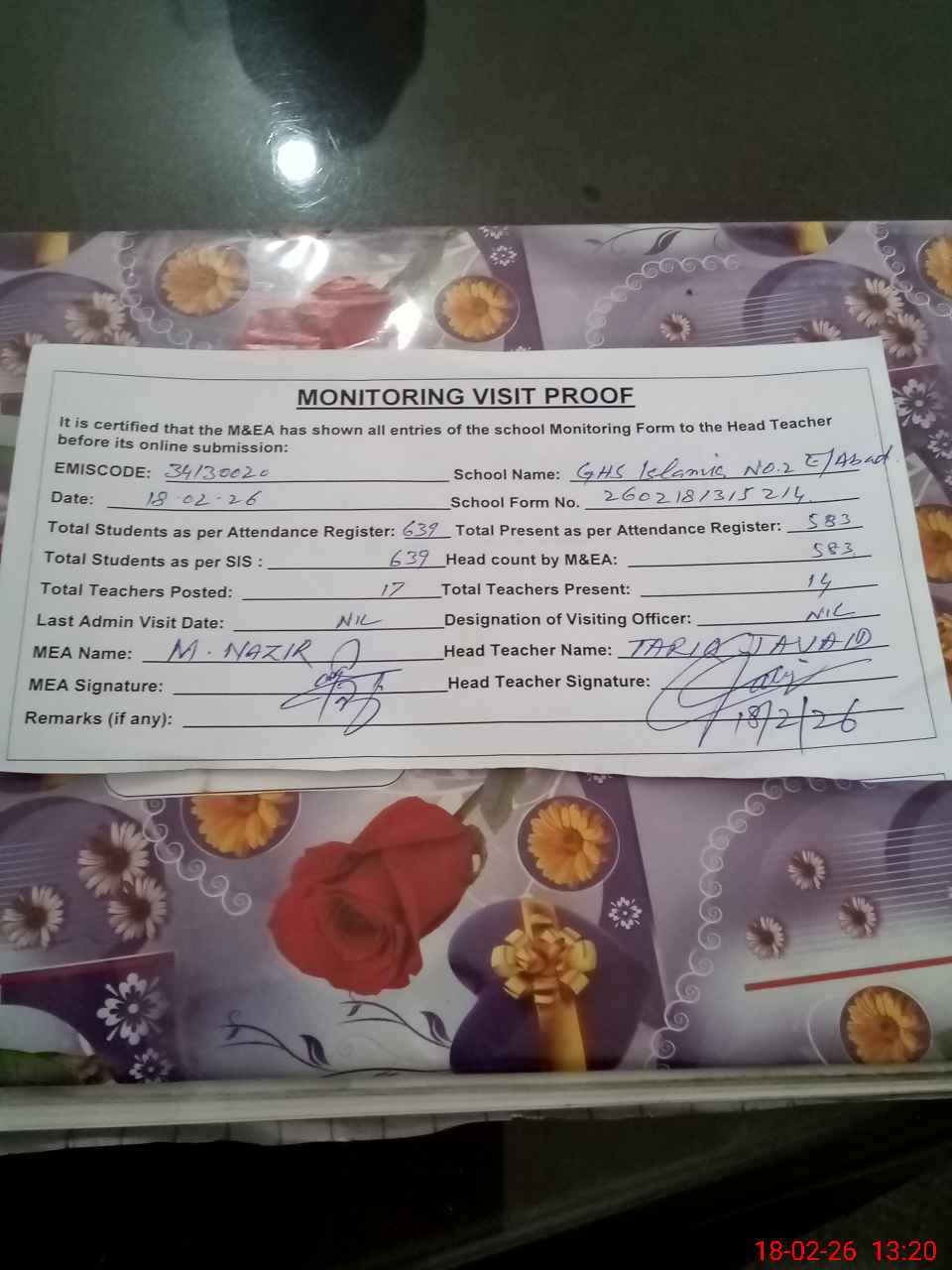 | Attendance Register | Head Teacher | MEA with School | Visit Proof |