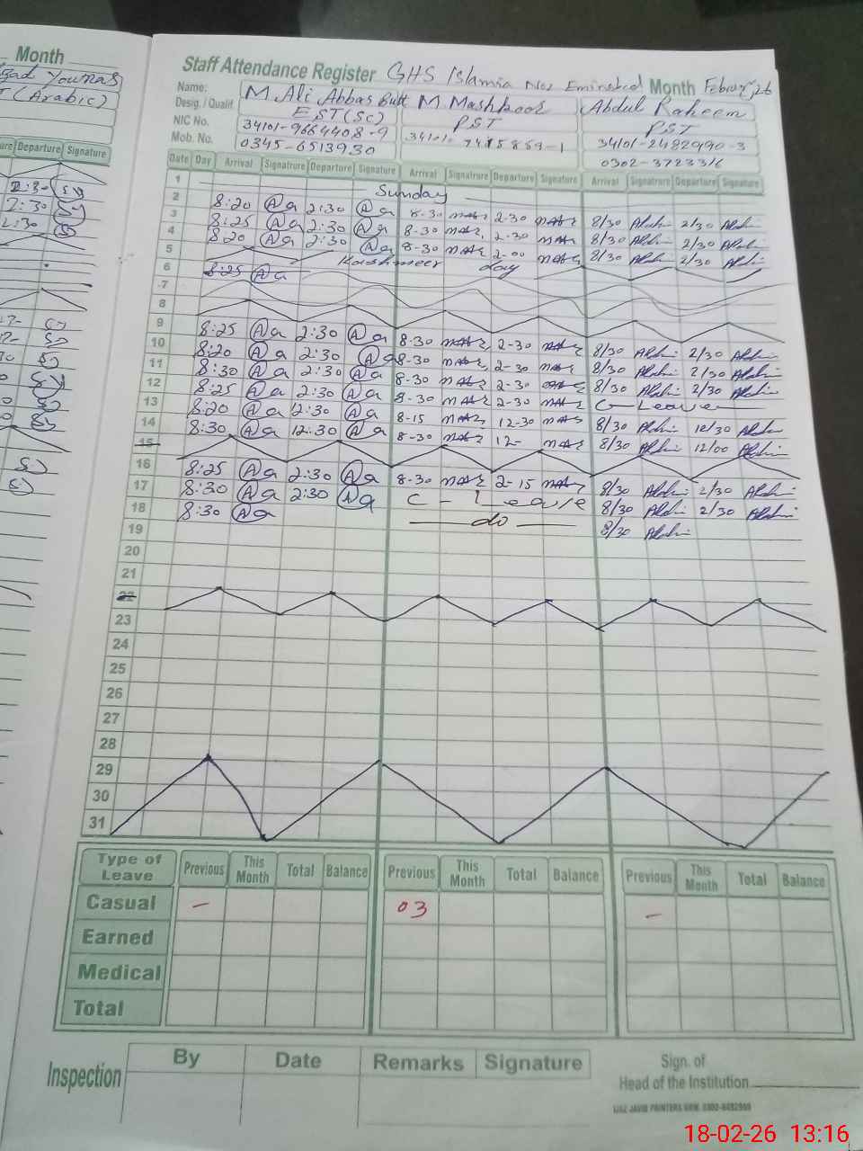 | CNIC | Full Name | Designation | R/C | Absence During Last Calender Month |