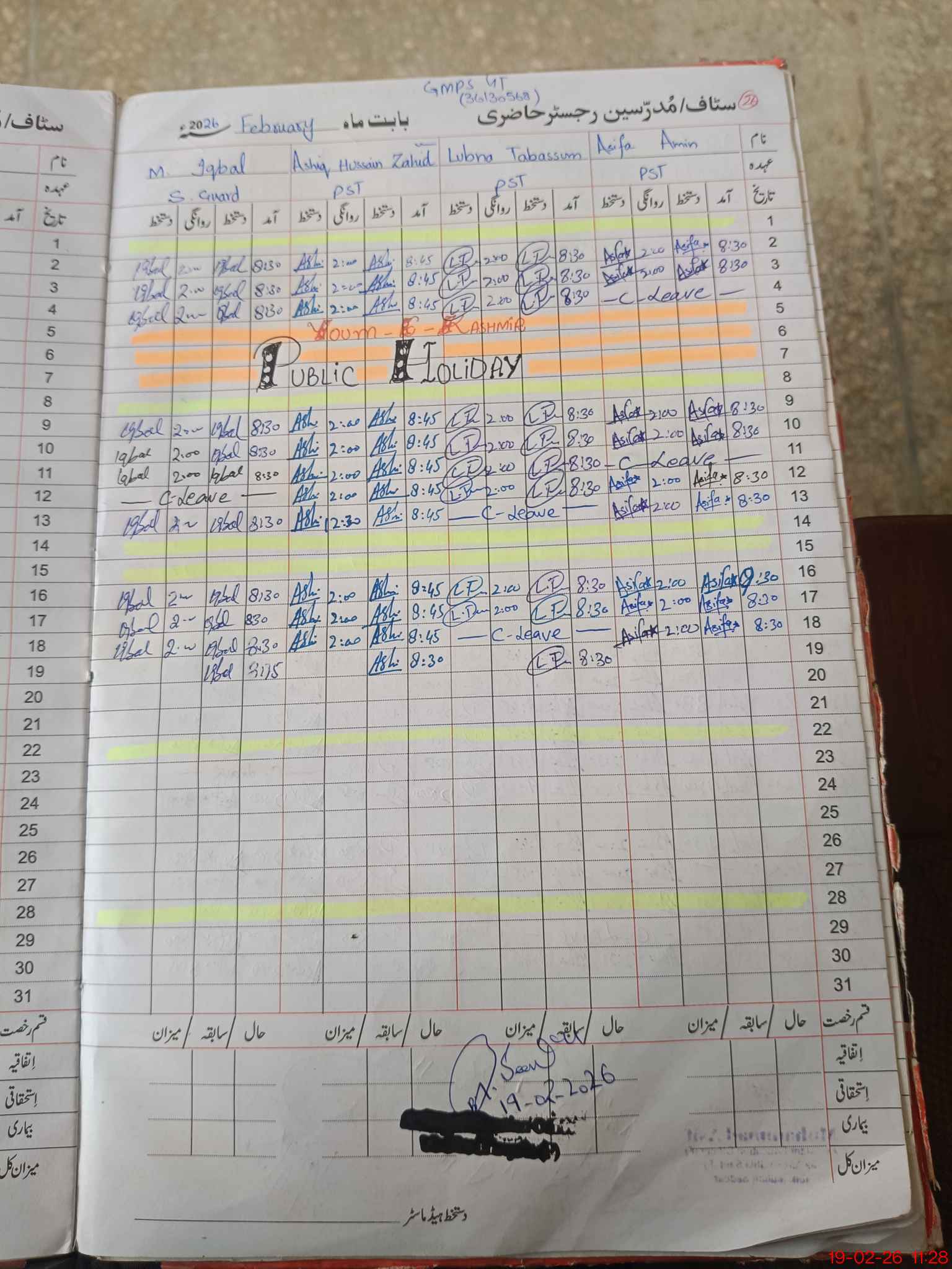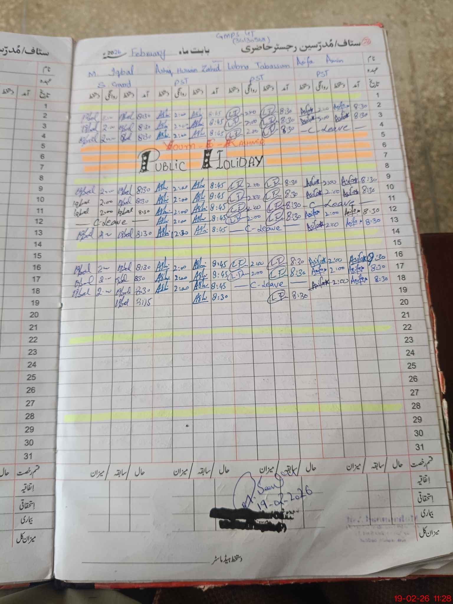 | CNIC | Full Name | Designation | R/C | Absence During Last Calender Month |