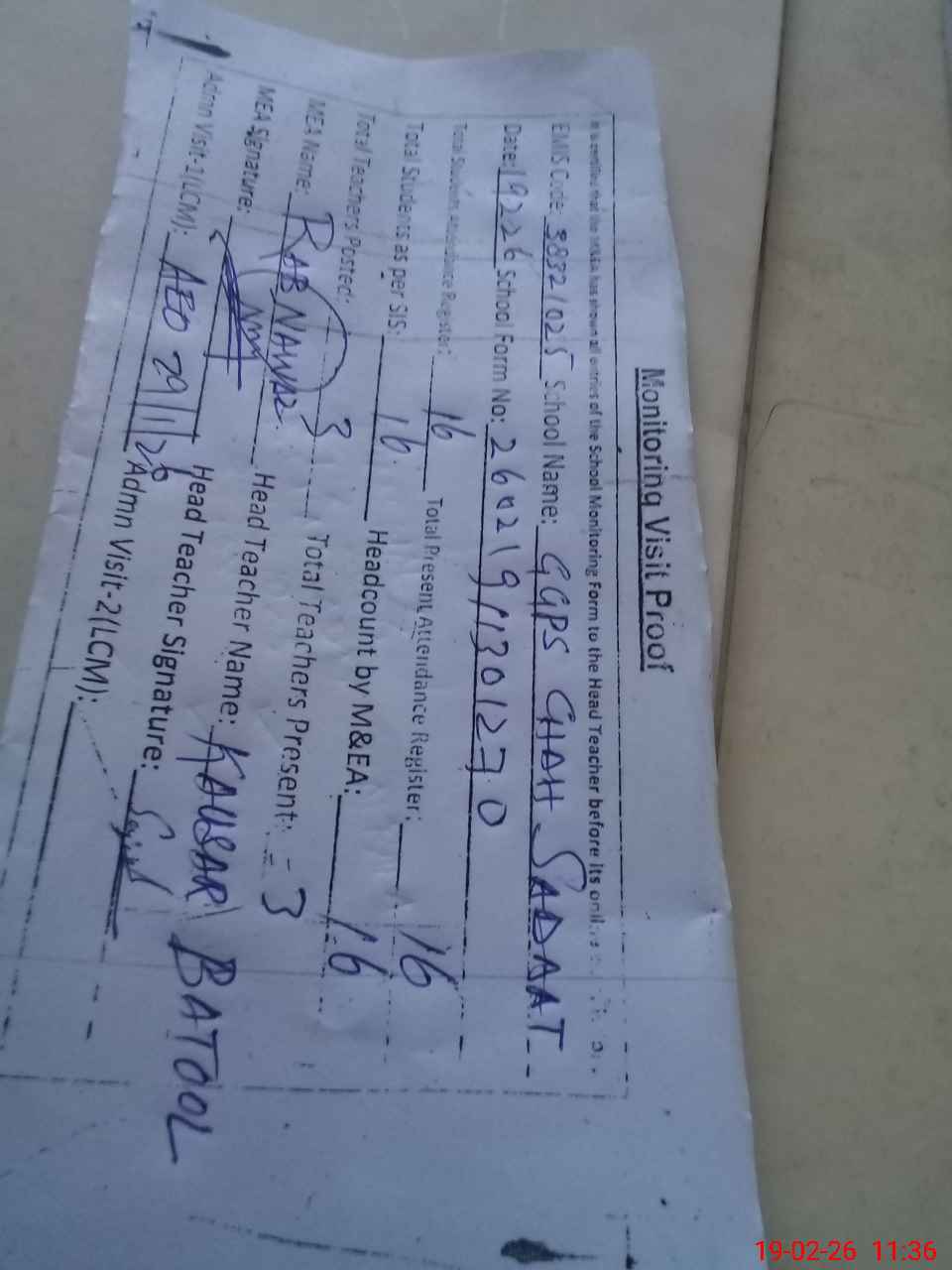 | Attendance Register | Head Teacher | MEA with School | Visit Proof |