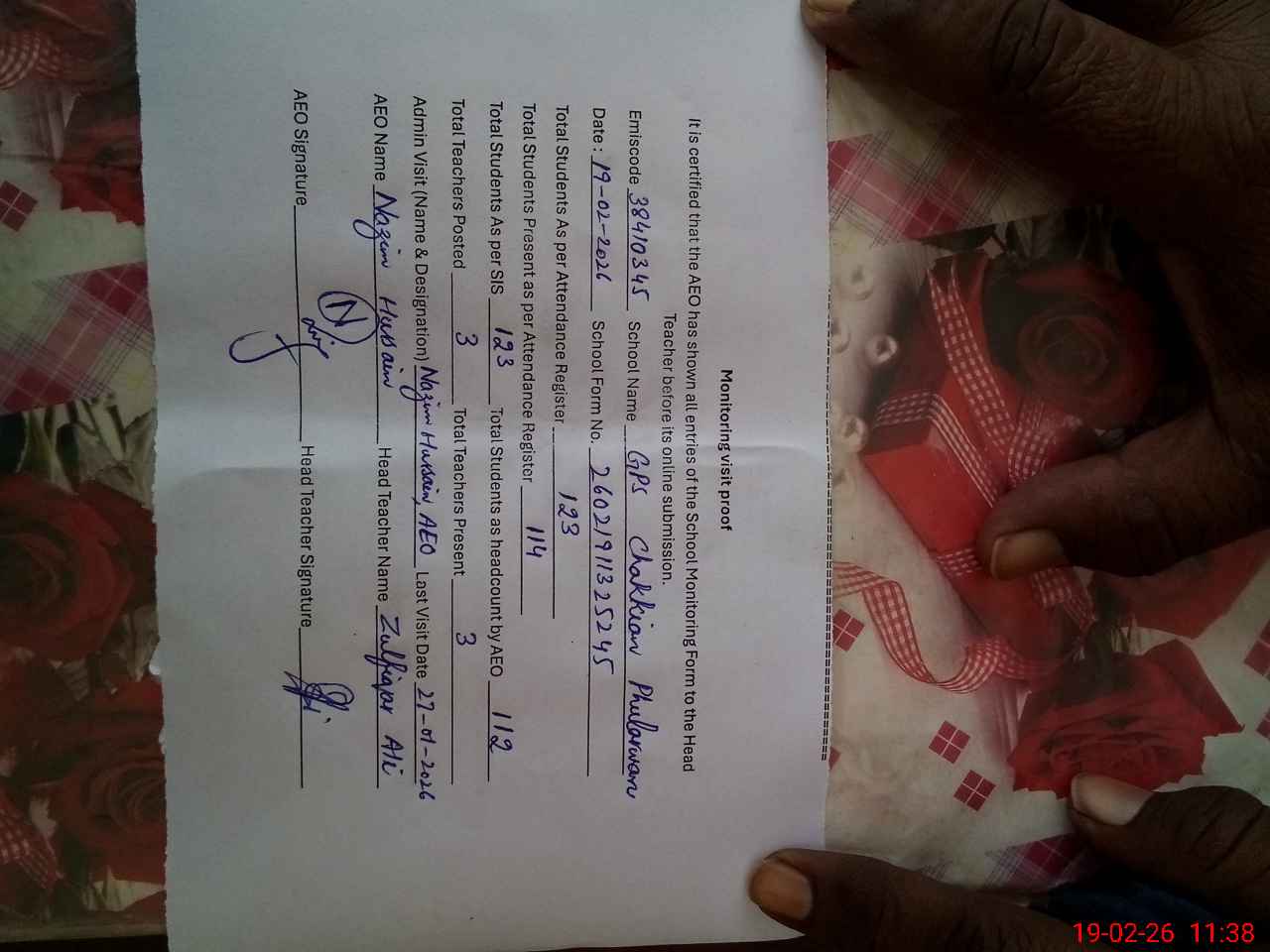 | Name: Zu**** Al**** Designation: (School Headmaster's/Headmistress's) PST Phone/Cell Number: 03**** 60**** |