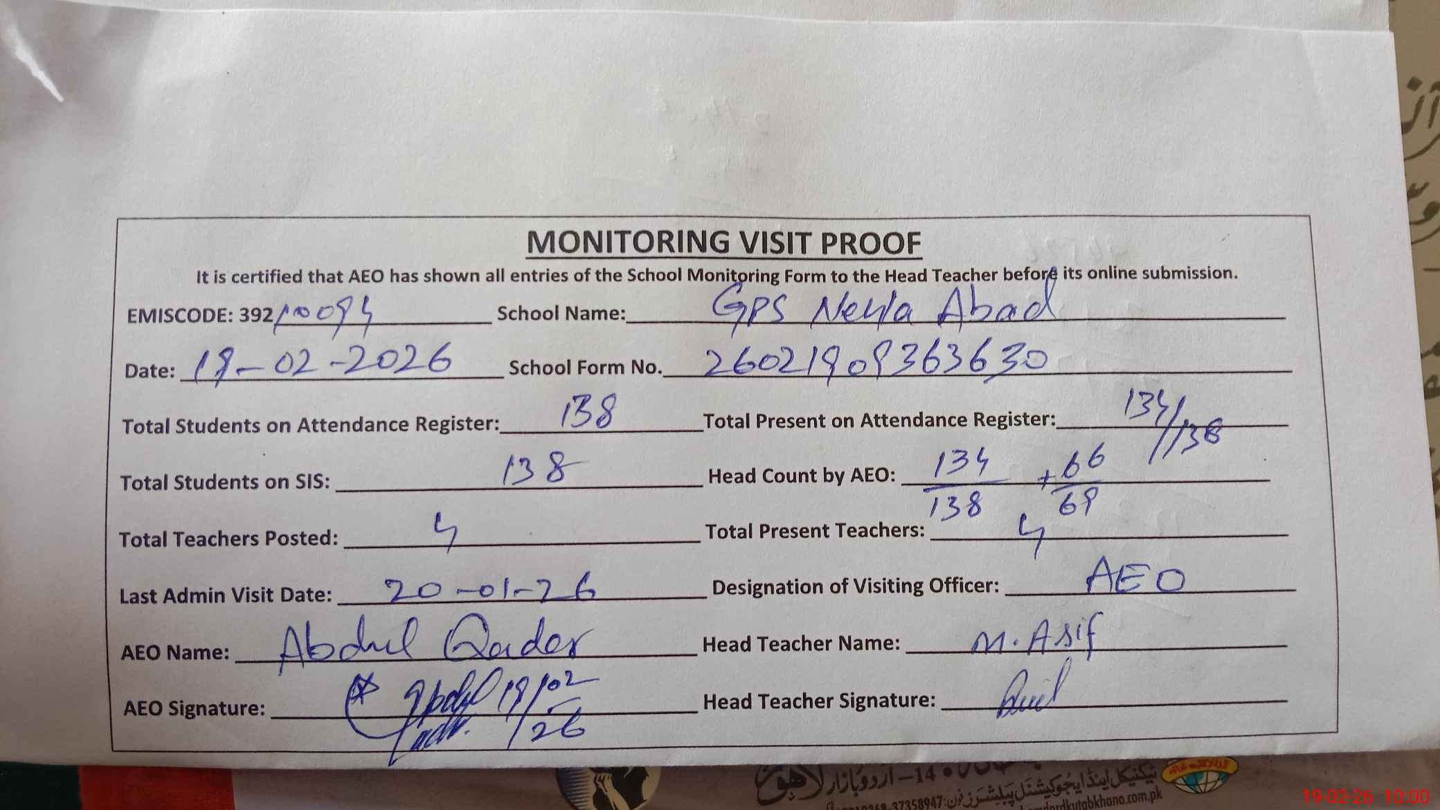 | Attendance Register | Head Teacher | MEA with School | Visit Proof |