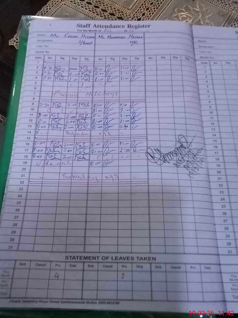 | CNIC | Full Name | Designation | R/C | Absence During Last Calender Month |