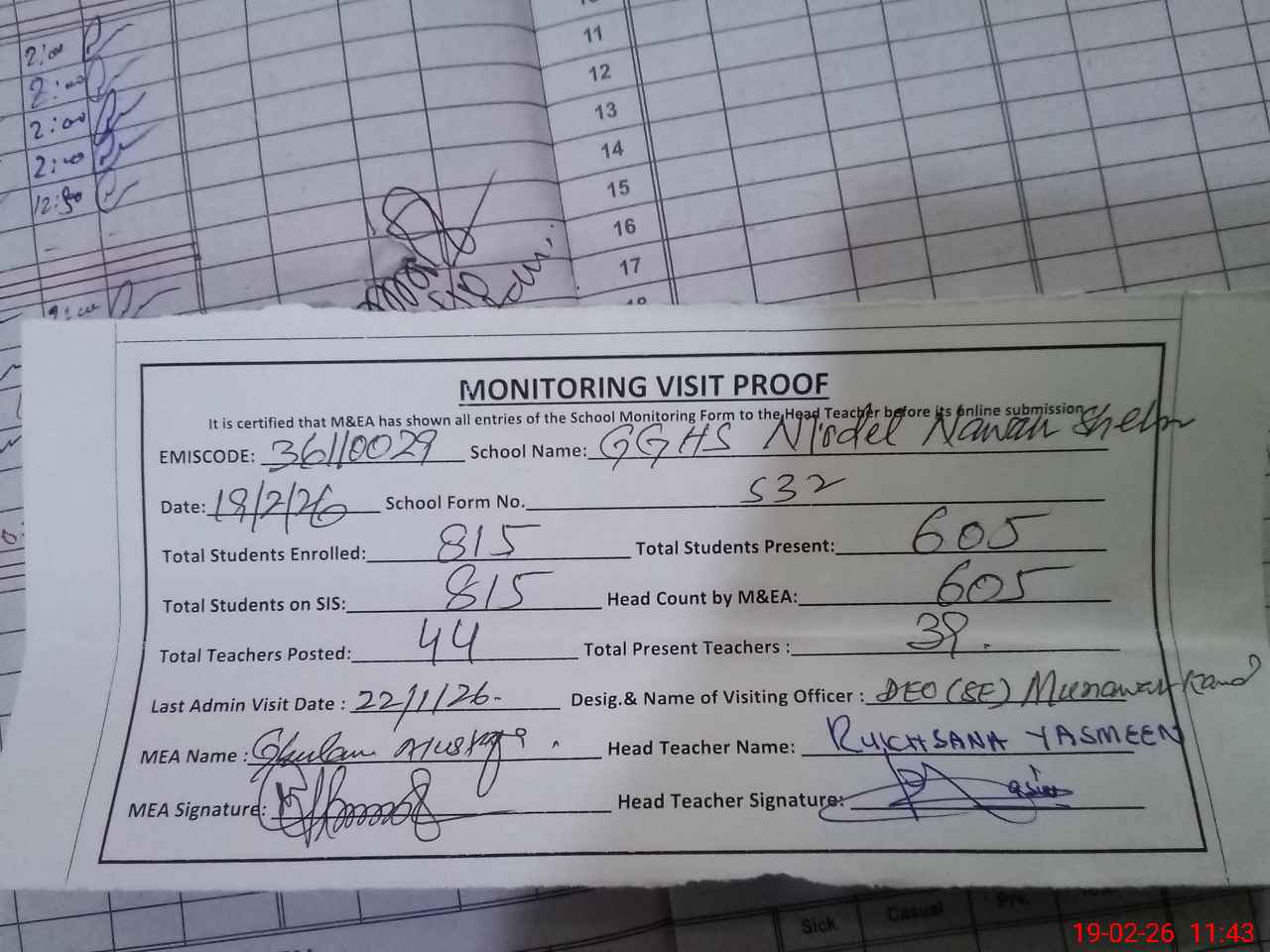 | Attendance Register | Head Teacher | MEA with School | Visit Proof |