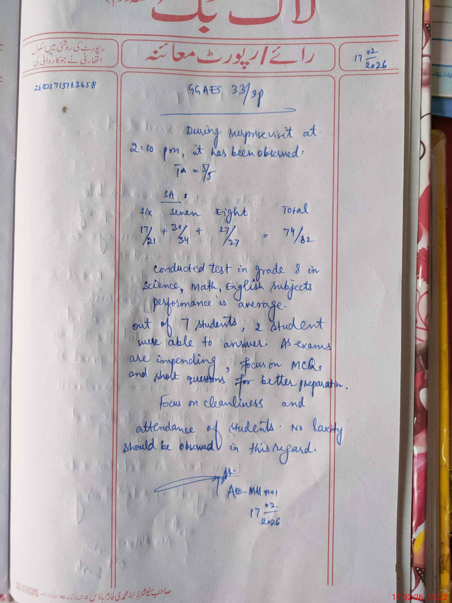 | Certified that this School was Inspected by the Undersigned MEA/DMO Today and the Information Stated Above is as Per Record. | |||||