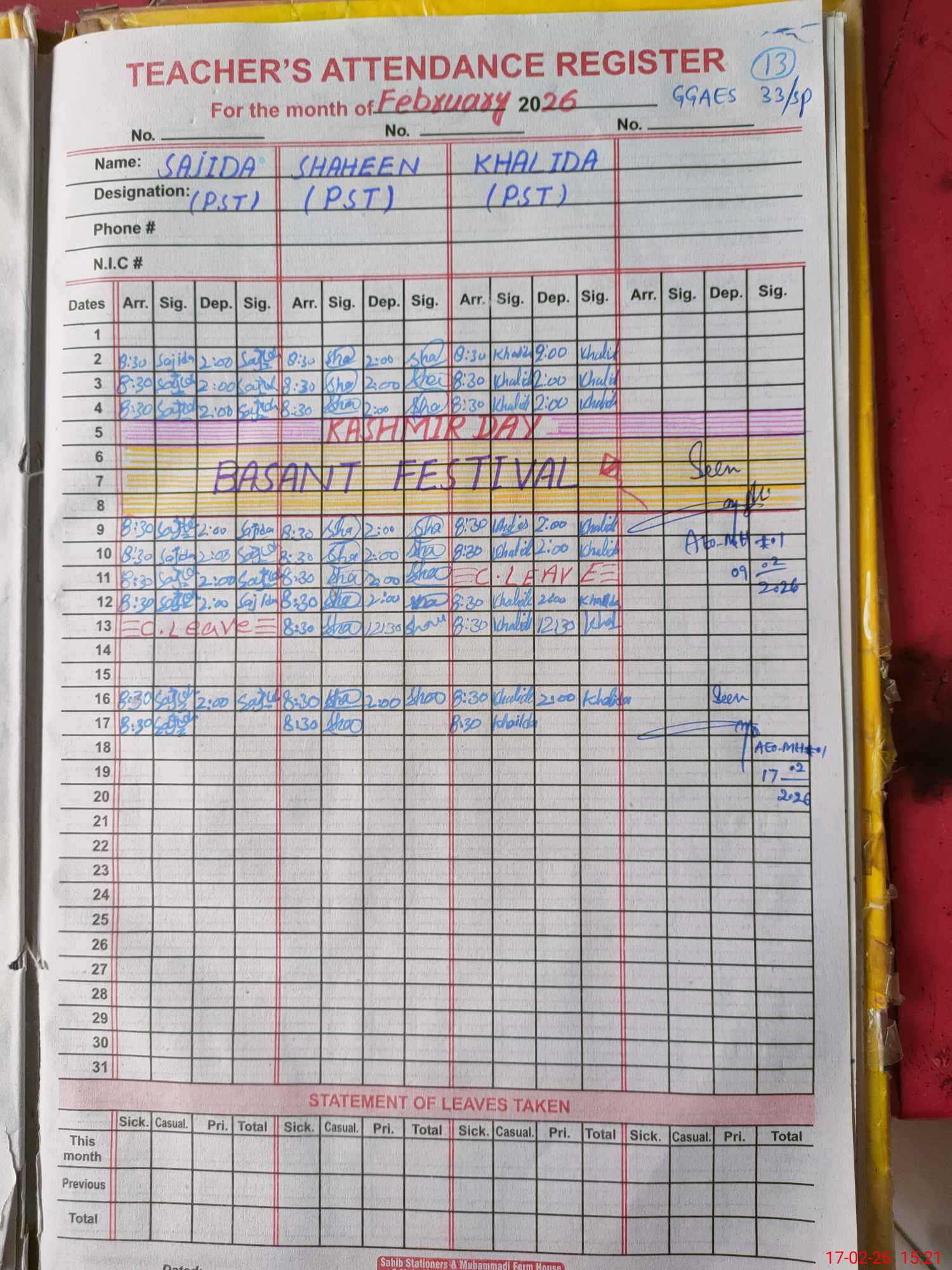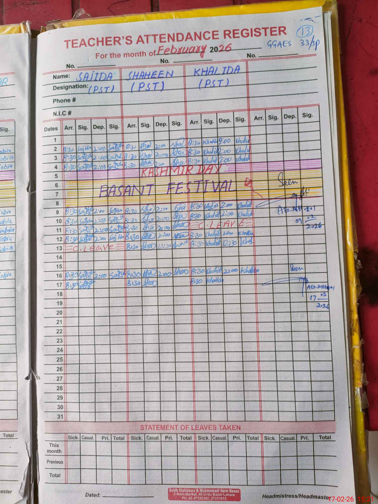 | CNIC | Full Name | Designation | R/C | Absence During Last Calender Month |