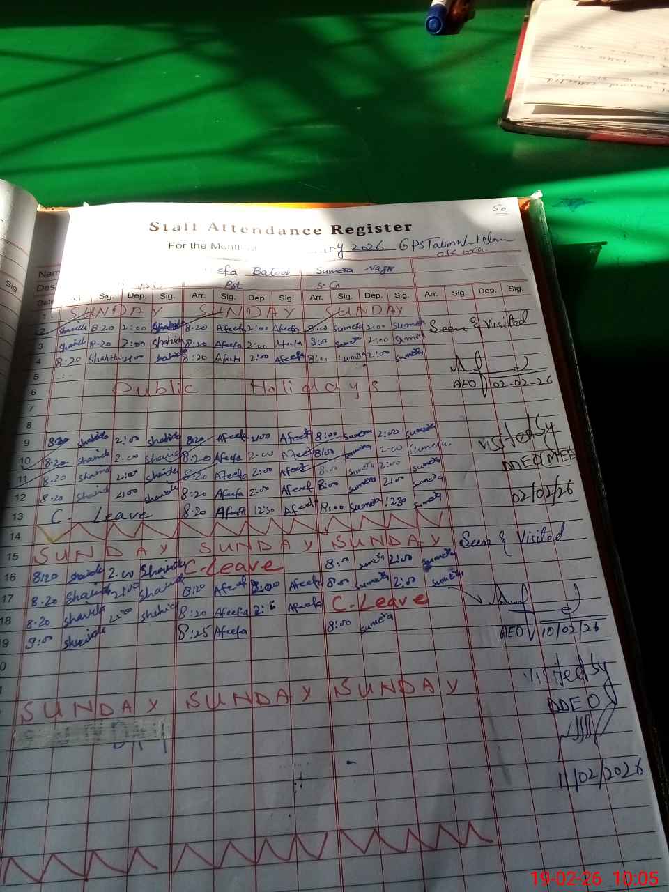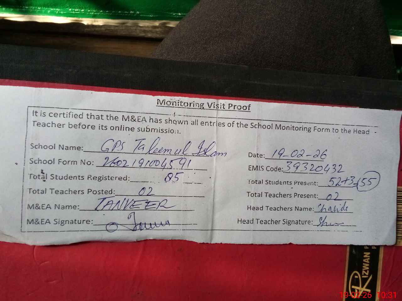 | Attendance Register | Head Teacher | MEA with School | Visit Proof |