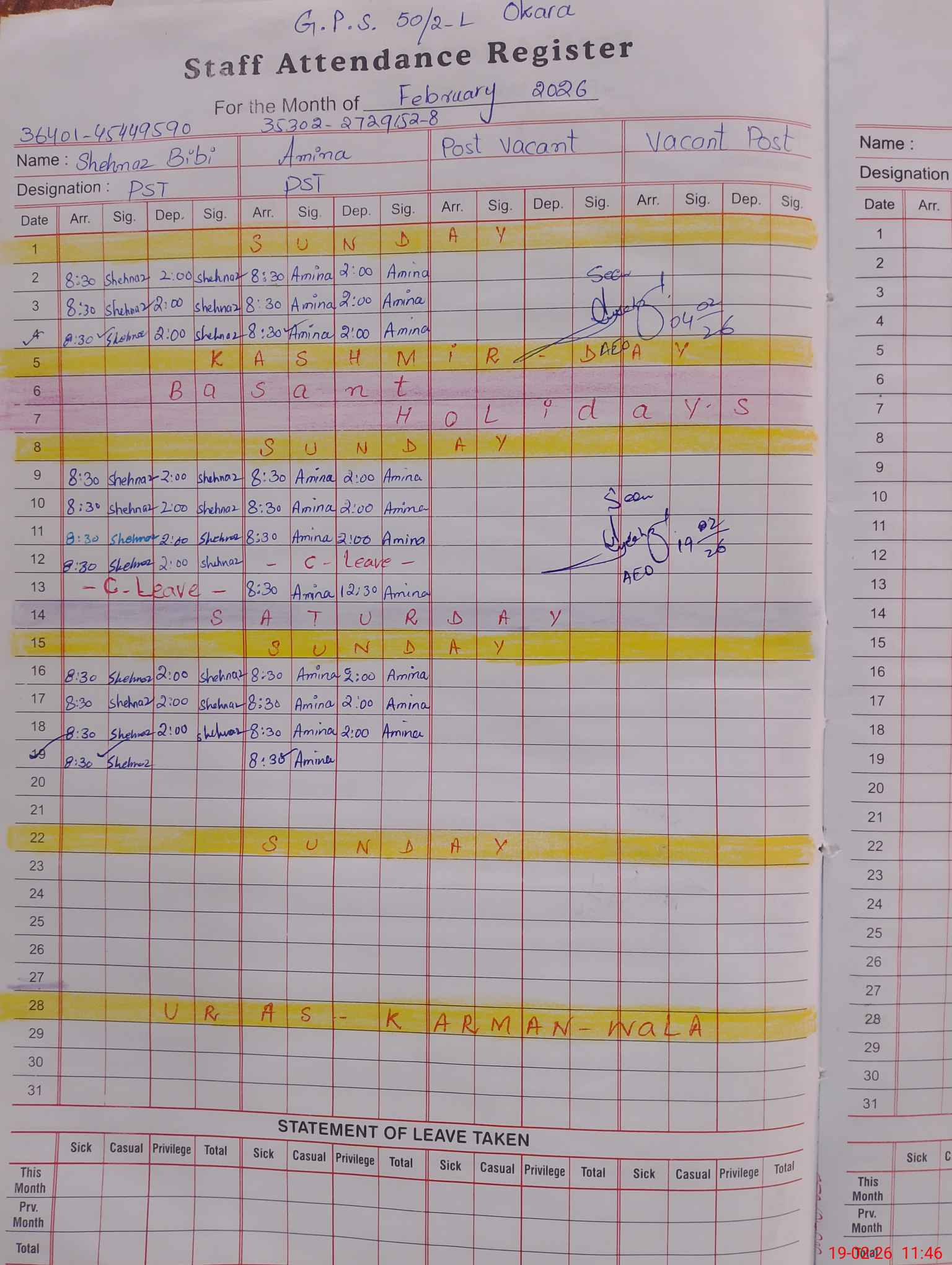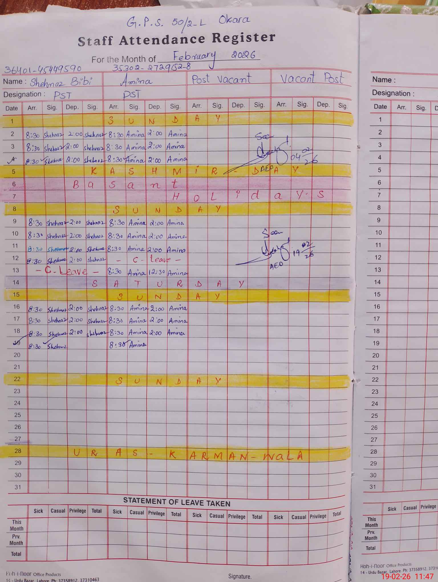 | Name: Sh**** Bi**** Designation: (School Headmaster's/Headmistress's) PST Phone/Cell Number: 03**** |