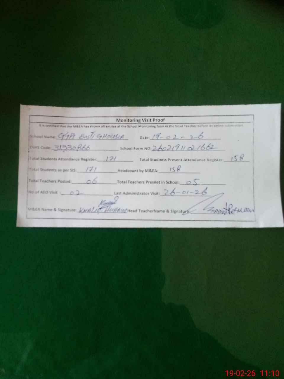 | Certified that this School was Inspected by the Undersigned MEA/DMO Today and the Information Stated Above is as Per Record. | |||||