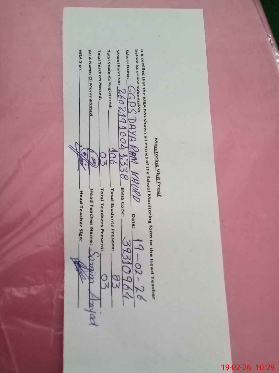 | Certified that this School was Inspected by the Undersigned MEA/DMO Today and the Information Stated Above is as Per Record. | |||||