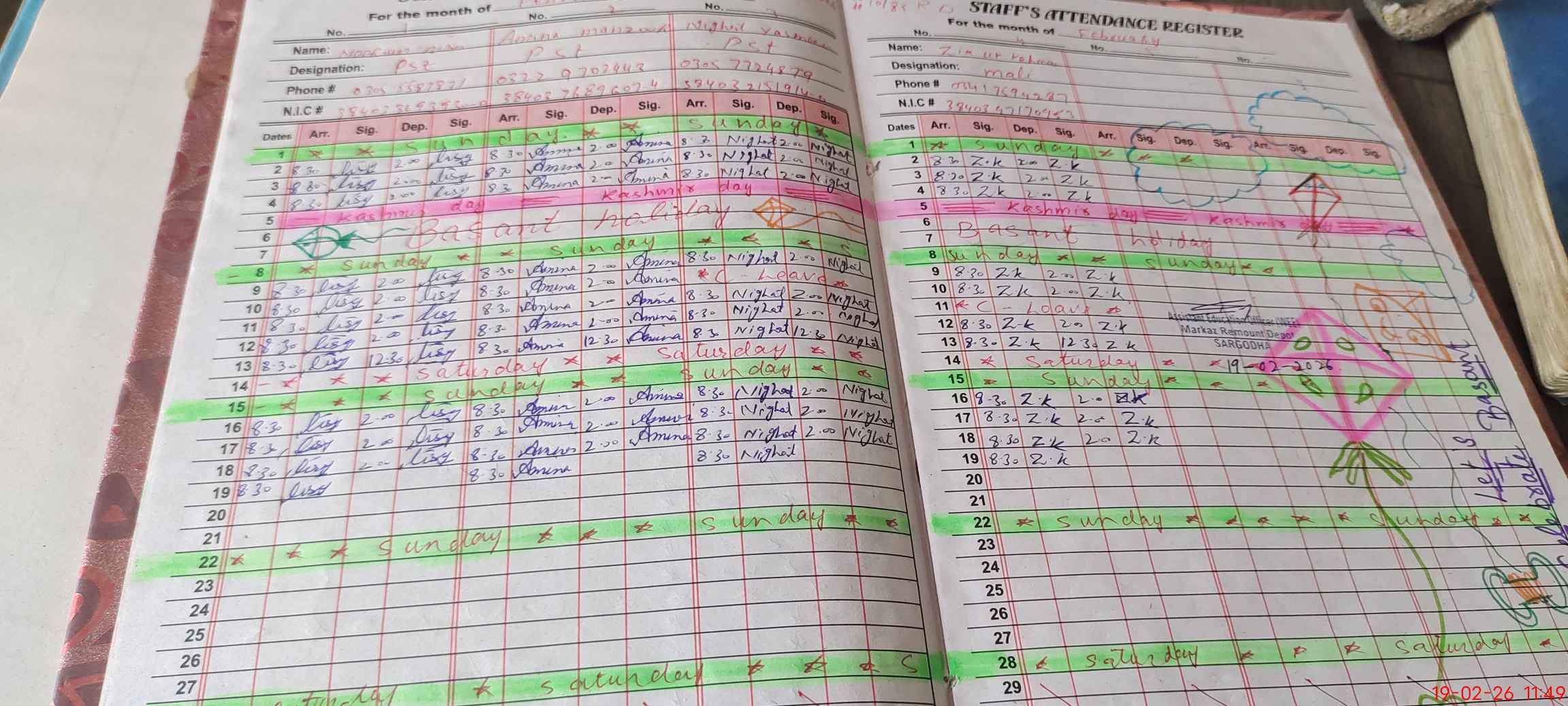 | CNIC | Full Name | Designation | R/C | Absence During Last Calender Month |