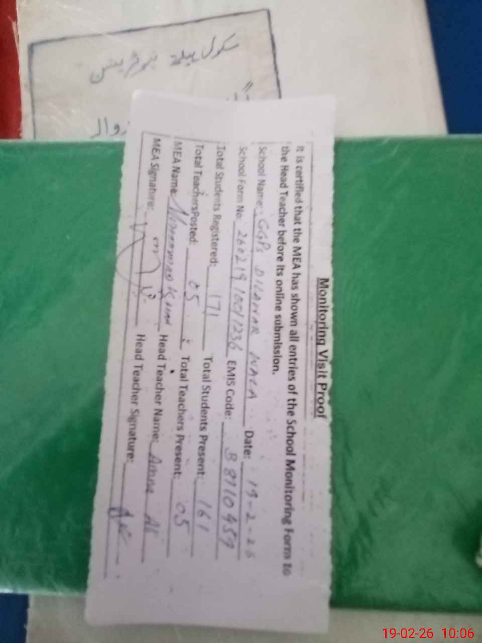 | Certified that this School was Inspected by the Undersigned MEA/DMO Today and the Information Stated Above is as Per Record. | |||||