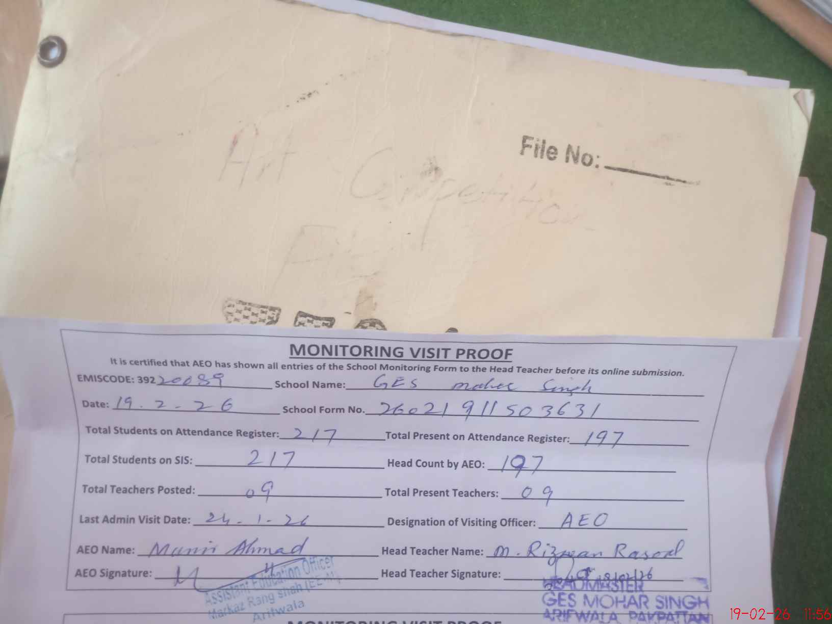 | Certified that this School was Inspected by the Undersigned MEA/DMO Today and the Information Stated Above is as Per Record. | |||||