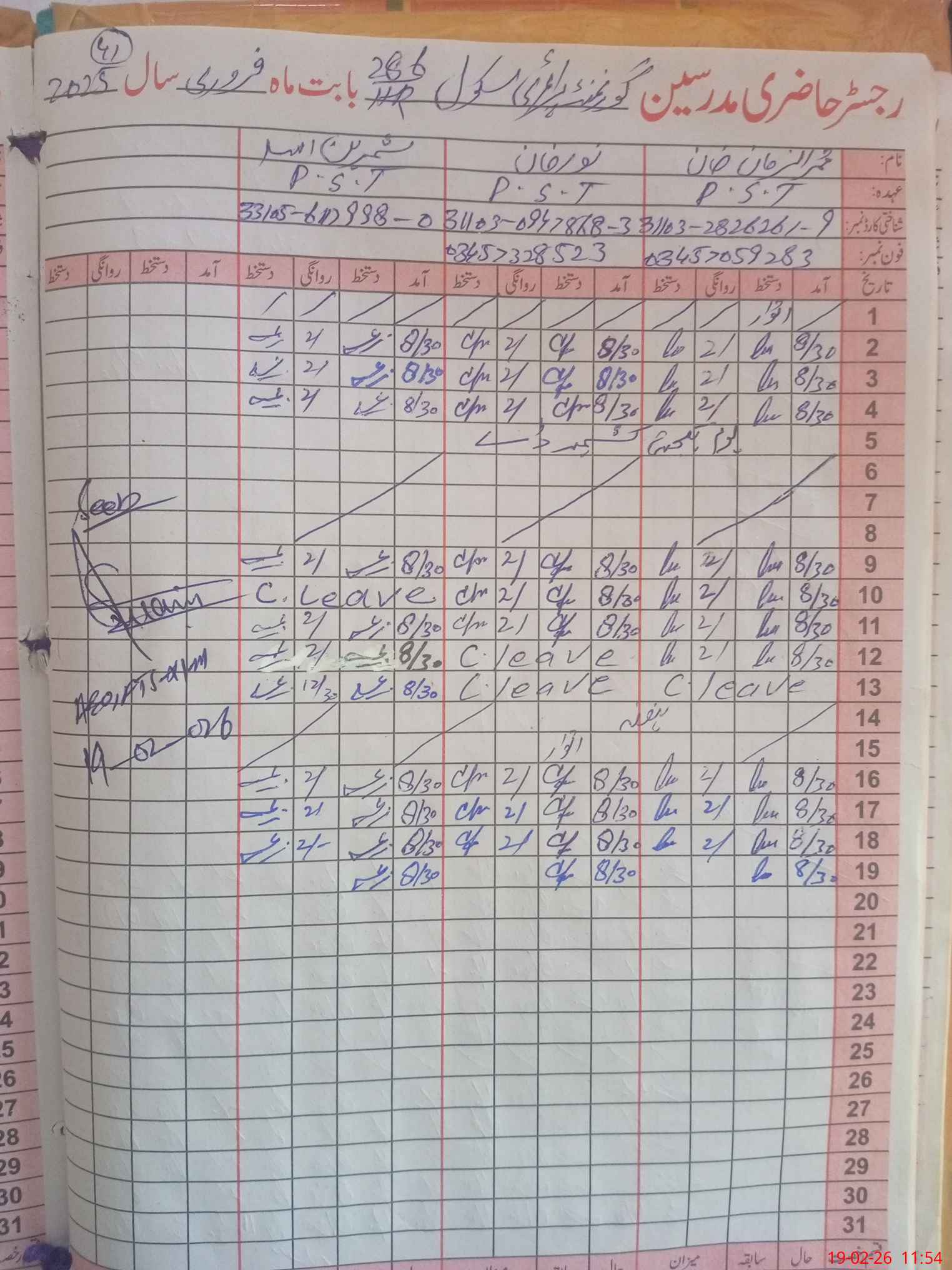 | CNIC | Full Name | Designation | R/C | Absence During Last Calender Month |