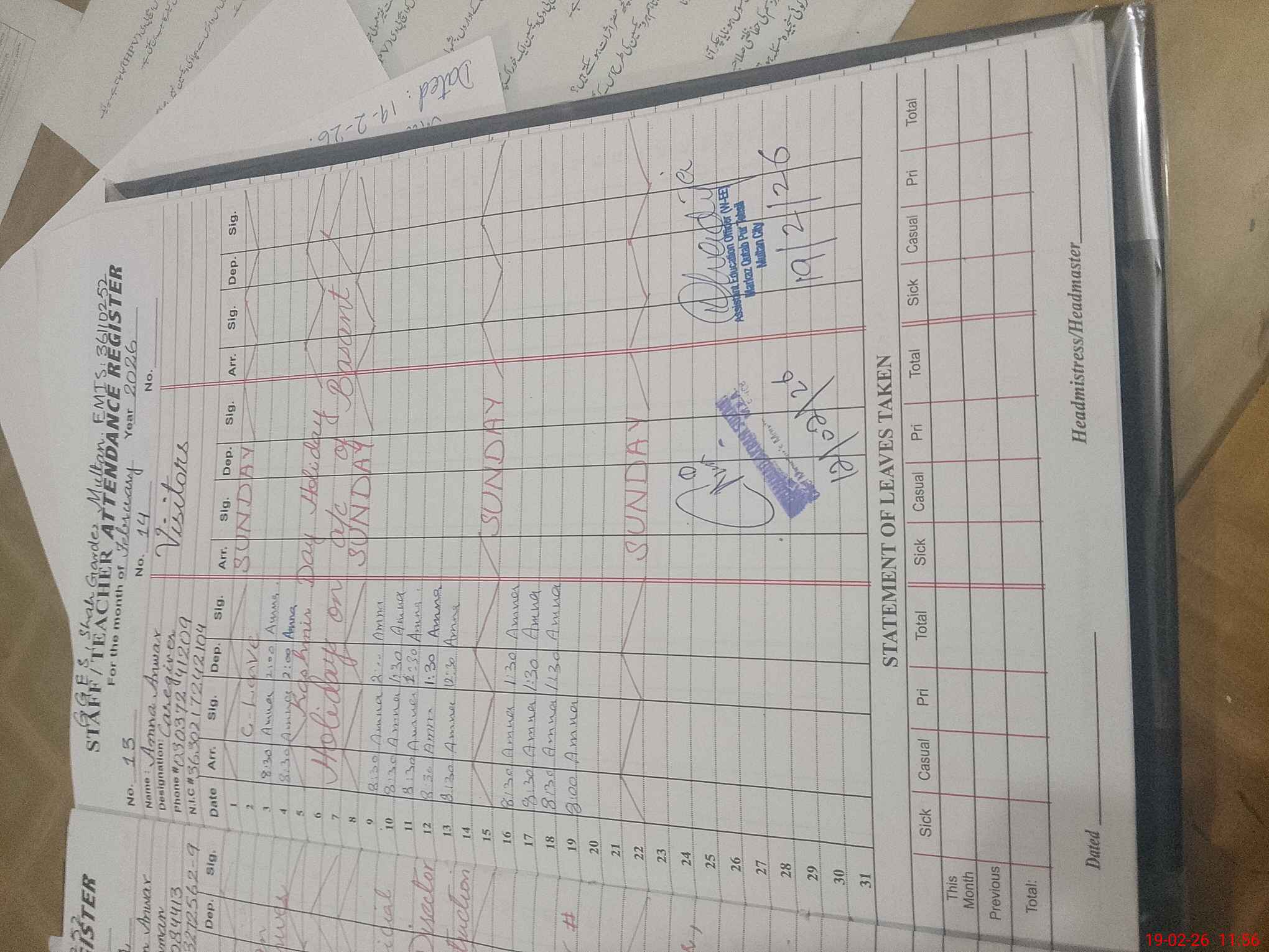 | CNIC | Full Name | Designation | R/C | Absence During Last Calender Month |
