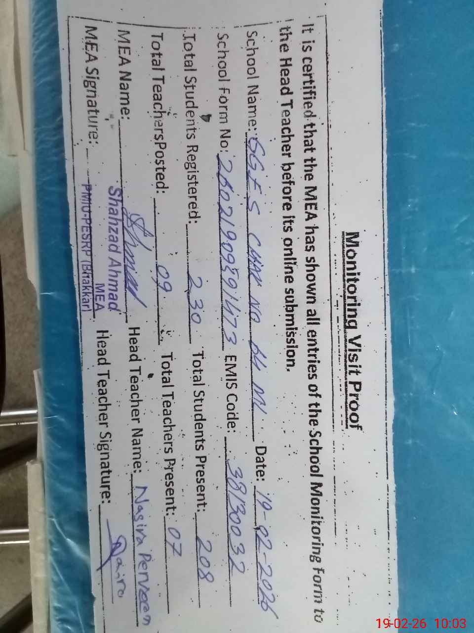 | Certified that this School was Inspected by the Undersigned MEA/DMO Today and the Information Stated Above is as Per Record. | |||||