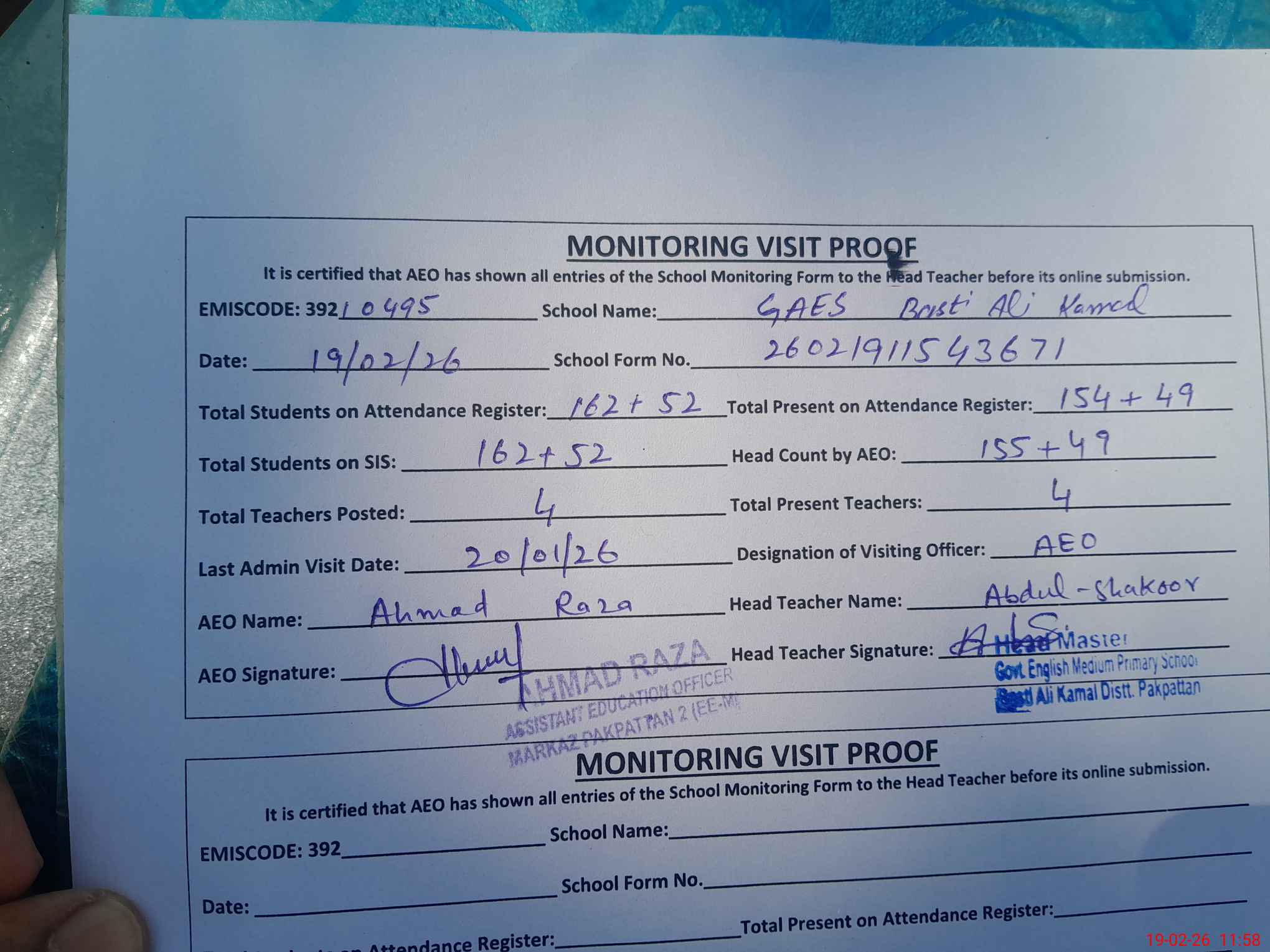 | Attendance Register | Head Teacher | MEA with School | Visit Proof |