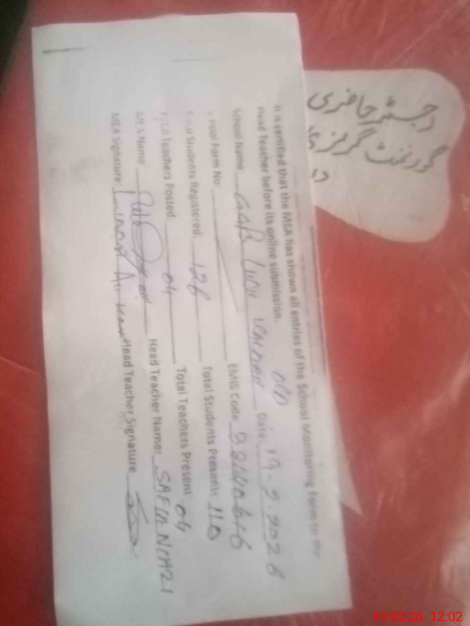 | Attendance Register | Head Teacher | MEA with School | Visit Proof |