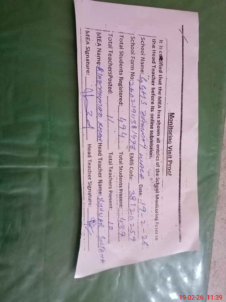 | Certified that this School was Inspected by the Undersigned MEA/DMO Today and the Information Stated Above is as Per Record. | |||||