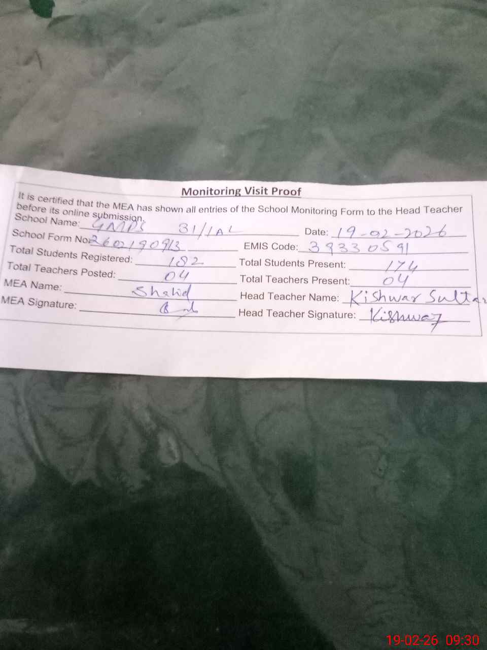 | Attendance Register | Head Teacher | MEA with School | Visit Proof |