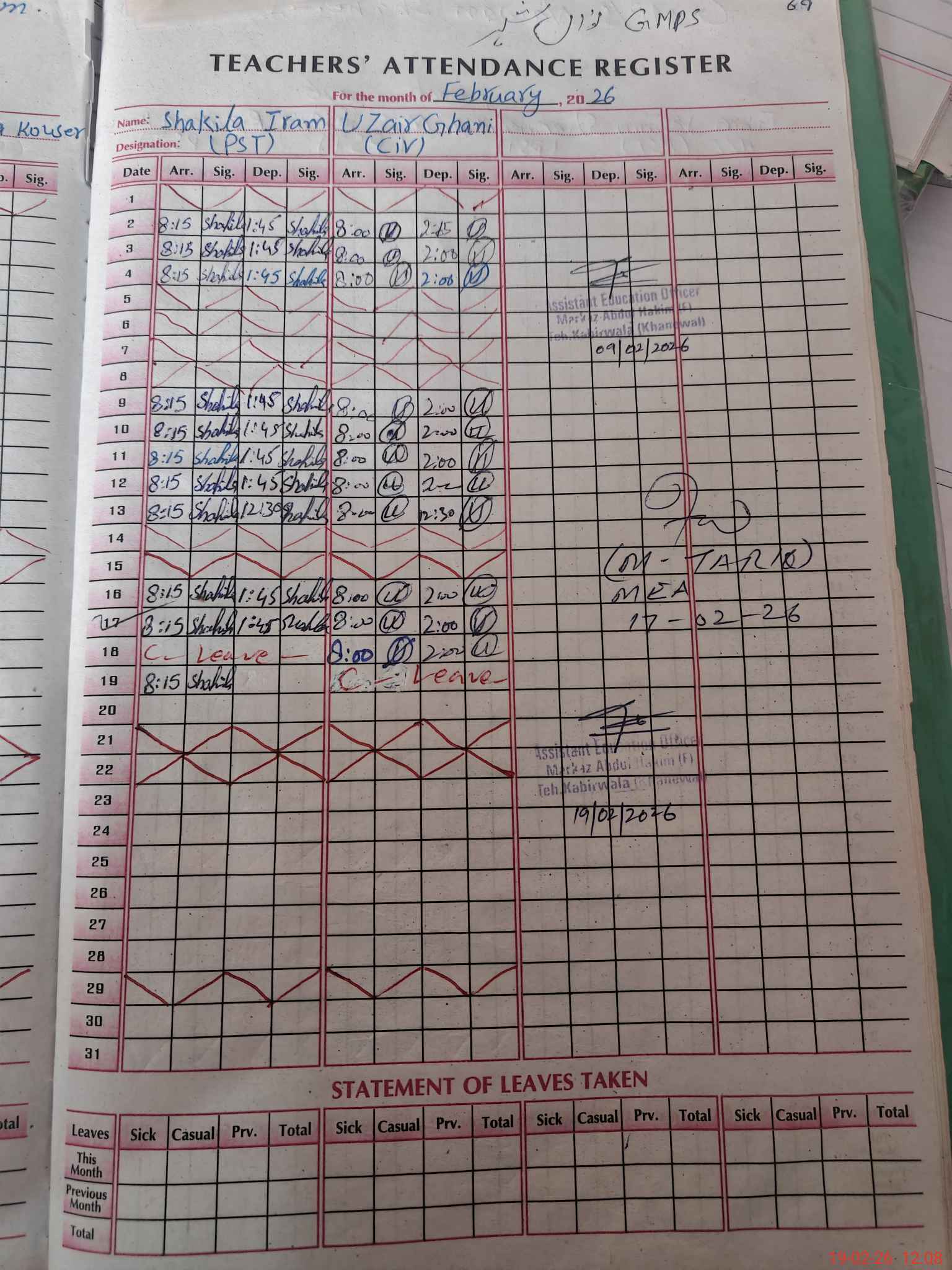 | Attendance Register | Head Teacher | MEA with School | Visit Proof |