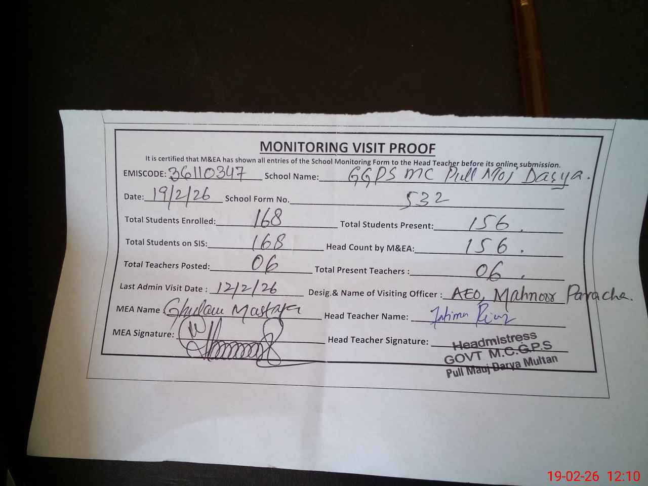 | Certified that this School was Inspected by the Undersigned MEA/DMO Today and the Information Stated Above is as Per Record. | |||||