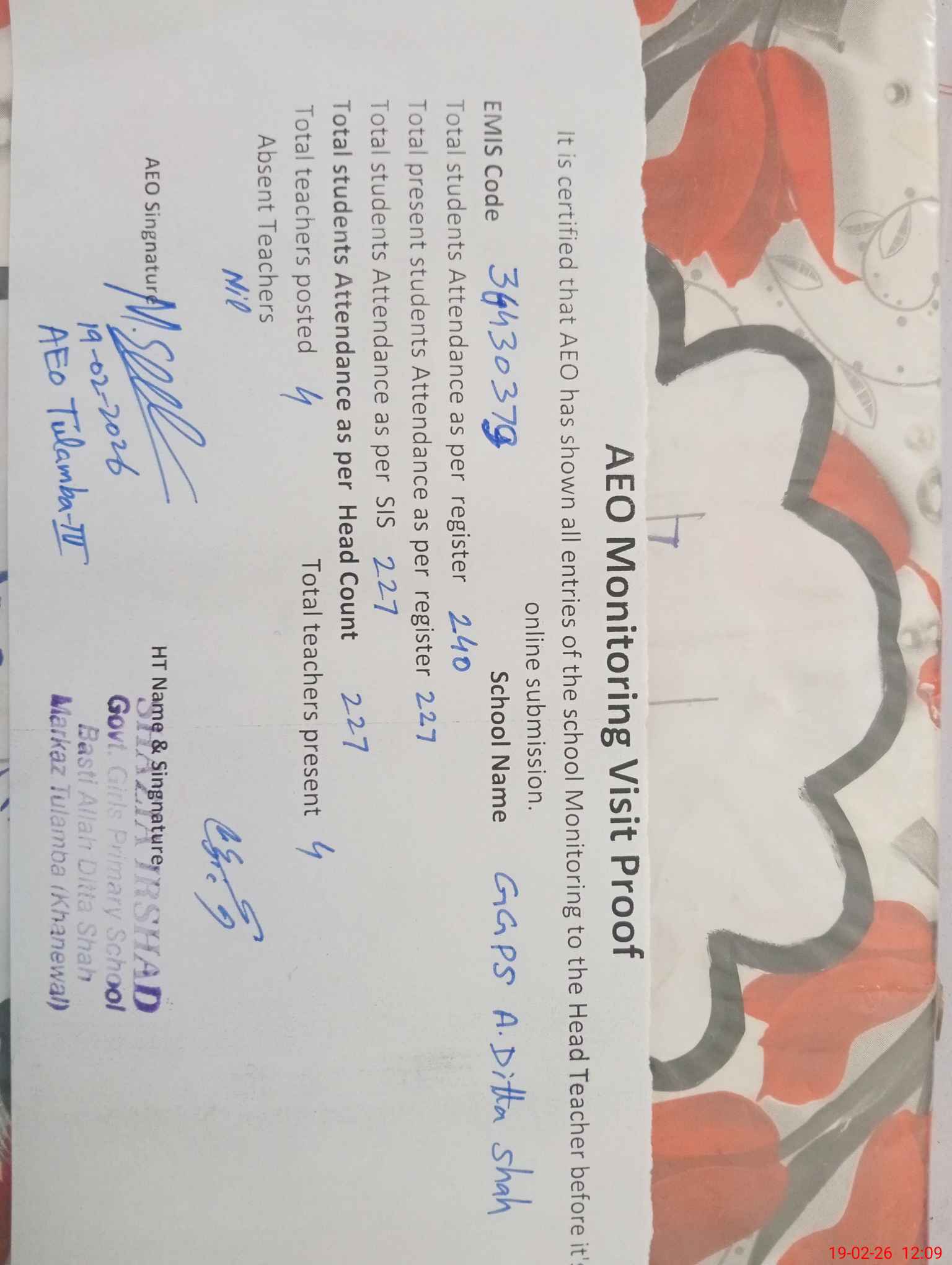 | EMIS Code: 36430379 | Name of School: GGPS BASTI ALLAH DITTAH SHAH, TULAMBA | |||