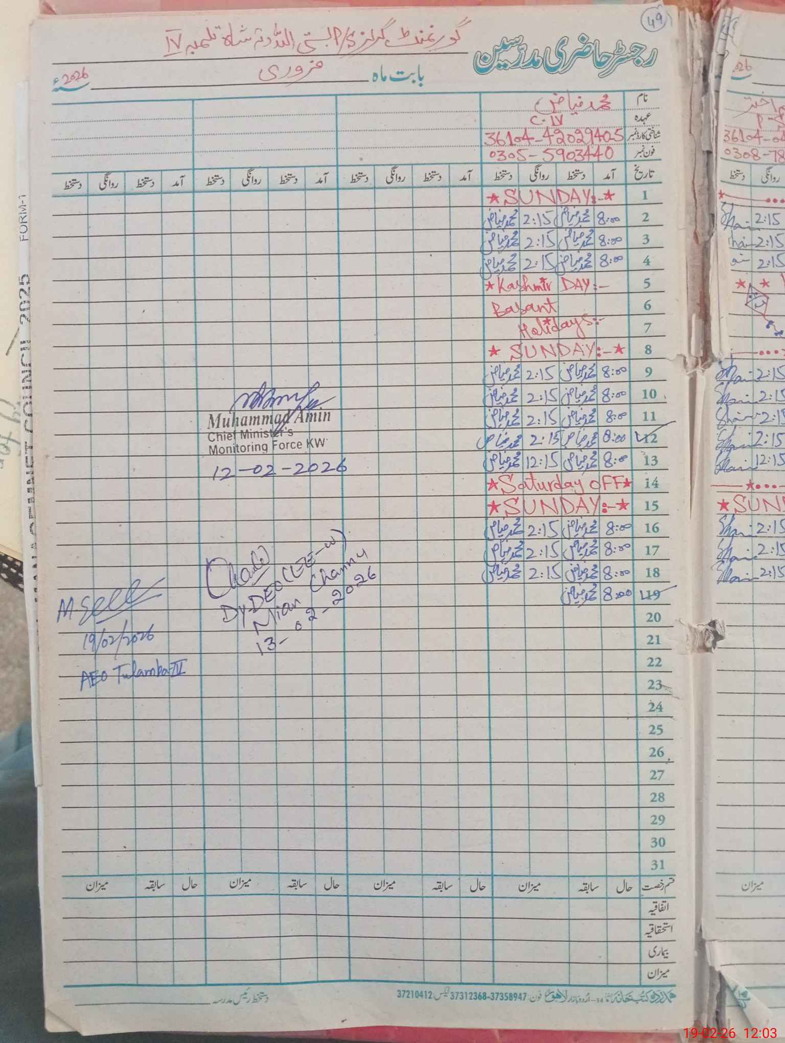 | Name: SH**** IR**** Designation: (School Headmaster's/Headmistress's) PST/PTC/JV Phone/Cell Number: 03**** |