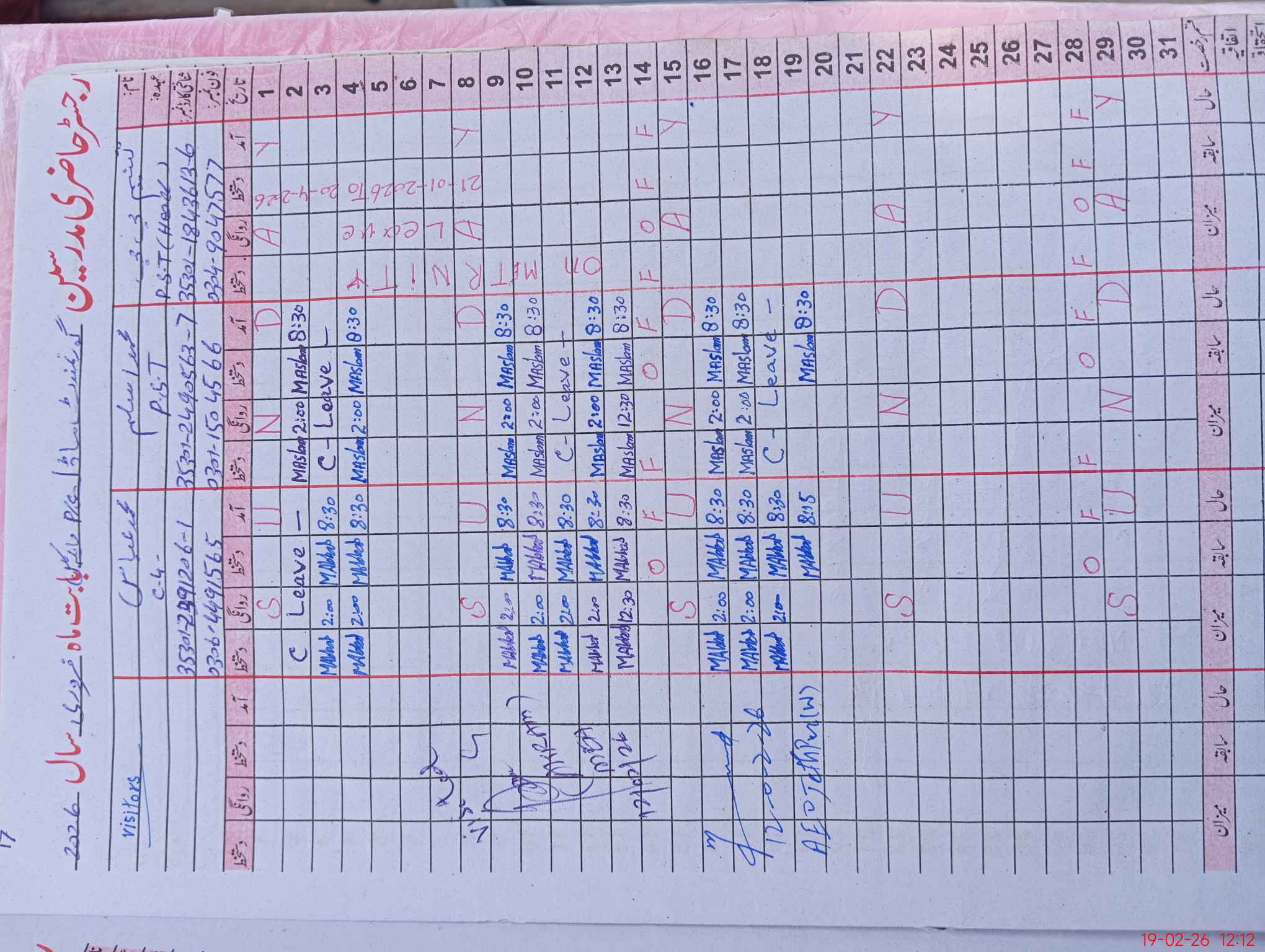 | CNIC | Full Name | Designation | R/C | Absence During Last Calender Month |