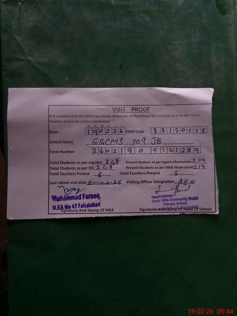 | EMIS Code: 33150115 | Name of School: GGCMS CHAK 109 JB | |||