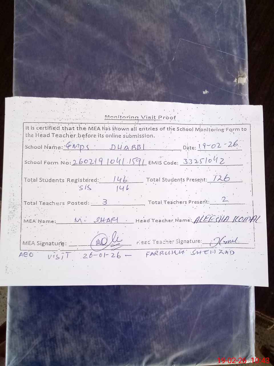 | EMIS Code: 33251042 | Name of School: GMPS DHABBI | |||