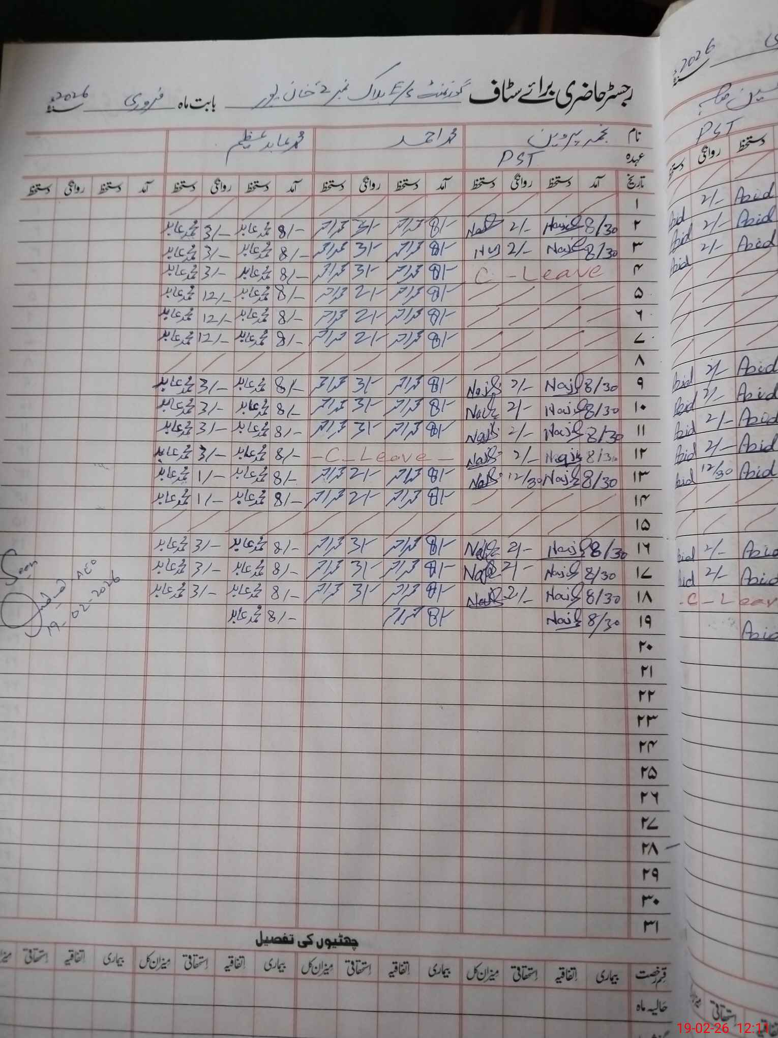 | CNIC | Full Name | Designation | R/C | Absence During Last Calender Month |