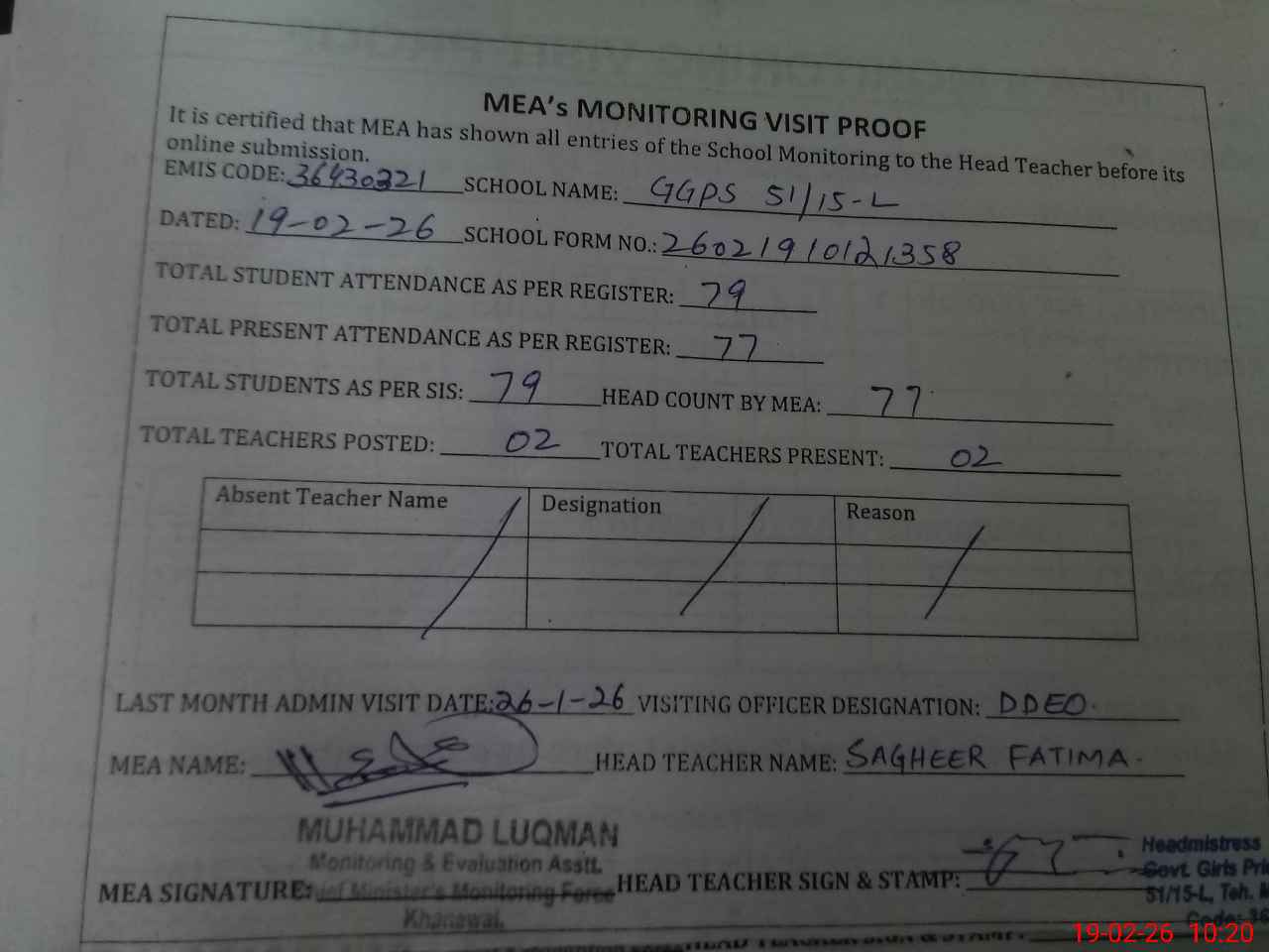 | Certified that this School was Inspected by the Undersigned MEA/DMO Today and the Information Stated Above is as Per Record. | |||||