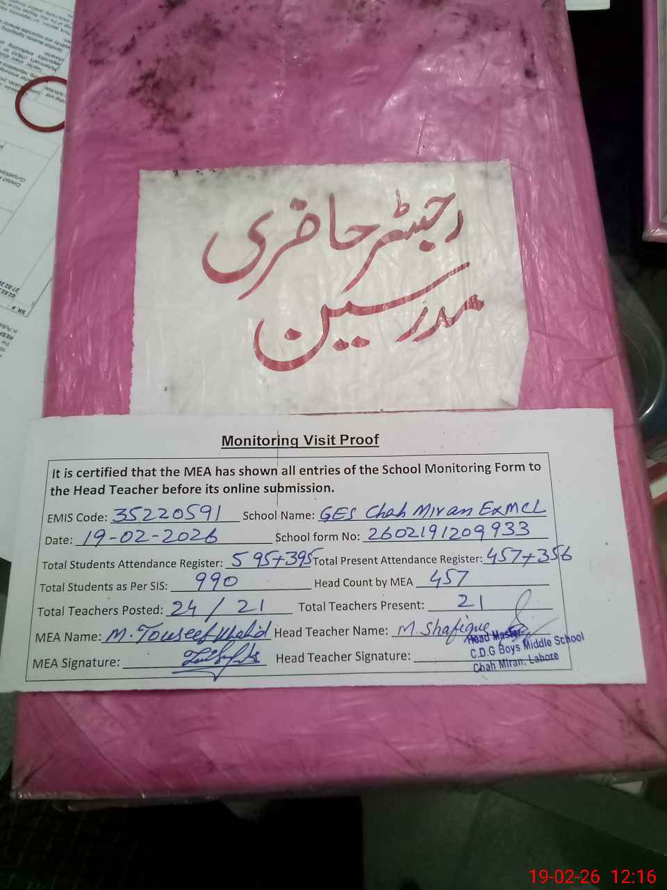 | Attendance Register | Head Teacher | MEA with School | Visit Proof |
